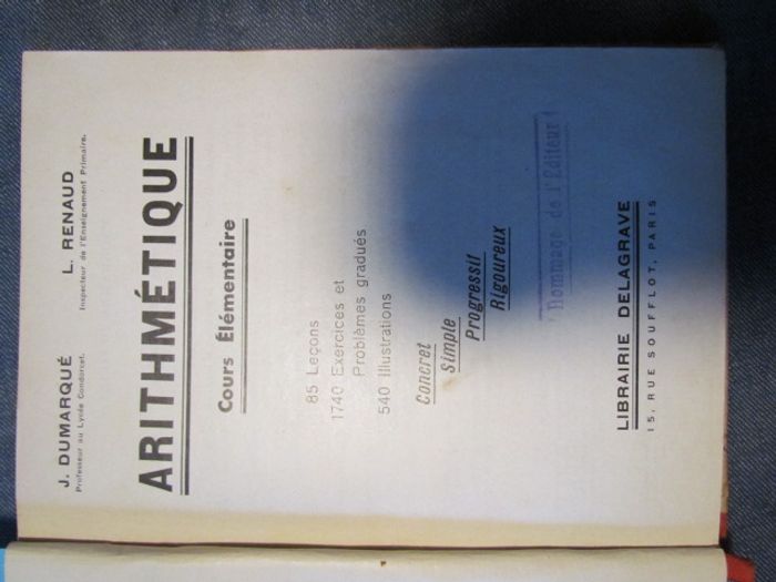 (1189) Livre "L'Arithmétique cours élémentaire" par J. Dumarqué et L. Renaud de 1934 Librairie Delagrave Paris Vendu dans l'état, merci de regarder les photos, car vous achetez ce que vous voyez. N'hésitez pas à me demander d'autres photos que je n'aurais pas pu mettre dans l'annonce Mes prix ne sont pas fixes, merci de faire une offre dans la mesure du raisonnable. Mes objets sont en vente sur d’autres sites. Pensez à regarder mes autres annonces, vous y trouverez sûrement votre bonheur
