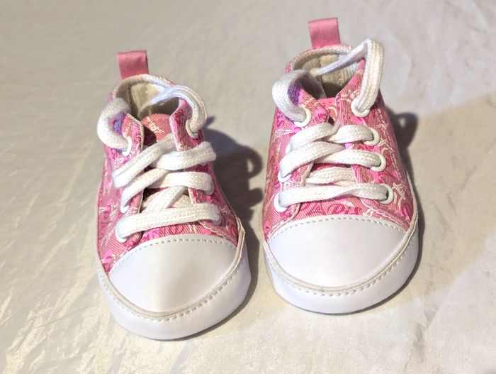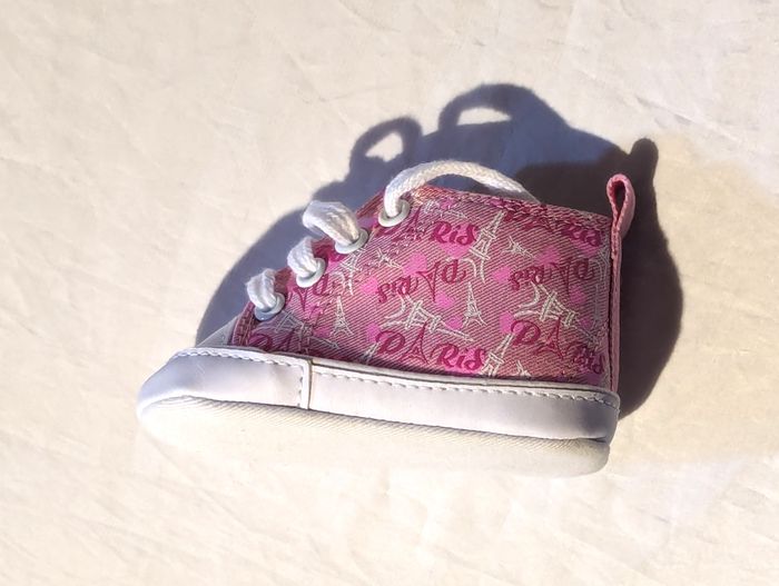 Petites Chaussures Roses avec des Ecritures sur la Ville de "Paris", des Dessins sur le Monument de la Tour Eiffel, des Petits Coeurs Roses et une Fermeture à Lacets Blancs. Accessoires pour les Petits Enfants et les Bébés. ☑ "Petites" Chaussures. ☑ Ecritures Ville "Paris". ☑ Monument "Tour Eiffel". ☑ "Petits" Coeurs. ☑ Fermeture "Lacets". Spécifications: Dimensions d'une Chaussure: Env. 11 x 7 x 6 cm Longueur d'une Chaussure (Pied): Env. 11 cm Taille (Pointure): 18 Couleur Dominante: Rose Couleur de la Tour Eiffel, des Semelles et des Lacets: Blanc Réf: ch1