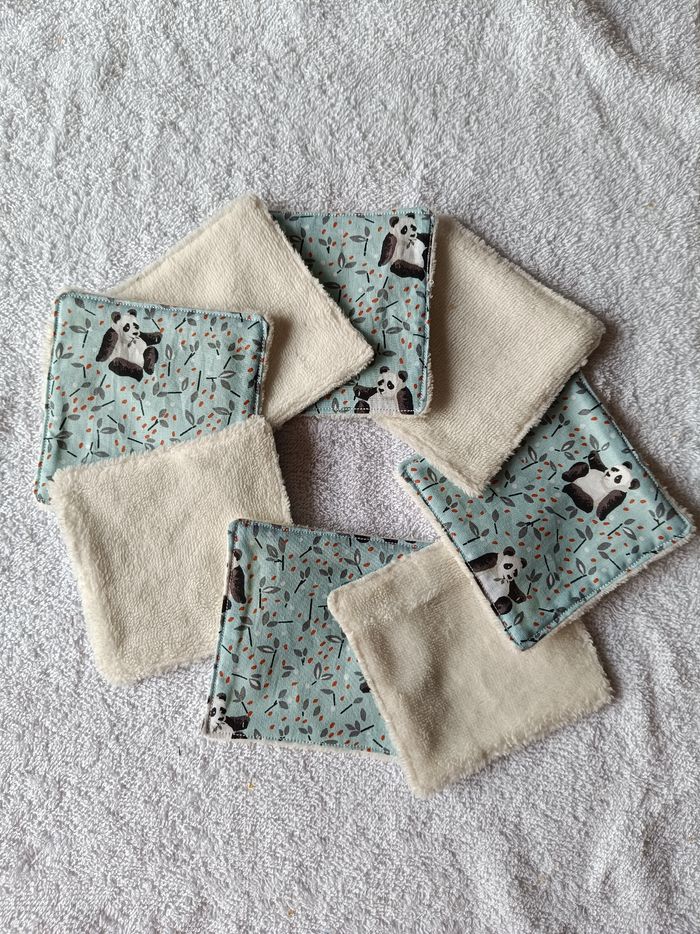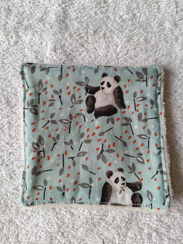 Vends lot 8 lingettes motif panda de 11 *11 cms et leur panière en coton et éponge de bambou eoko tek . Possibilité de rajouter d'autres lingettes ou d'en avoir avec éponge bambou noire ( 2 euros les 3 lingettes supplémentaires).