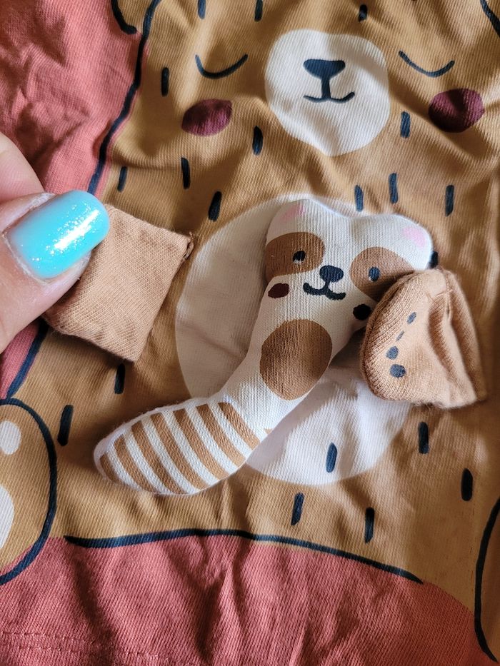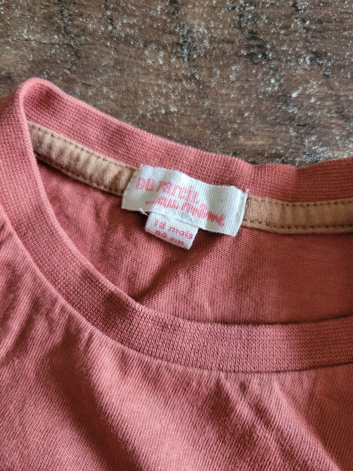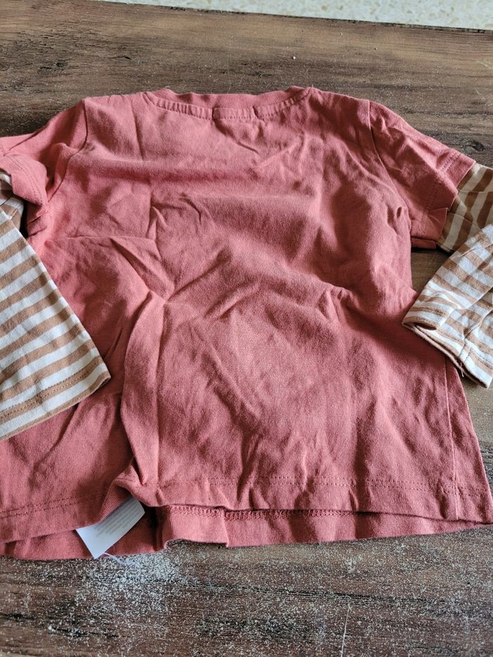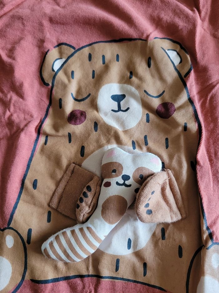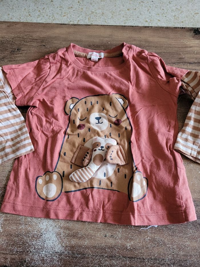 Petit T-shirt Manche longue Lège Couleur rouille Dessin ours avec son jouet Taille 18 mois Attaché en haut a gauche Matière 100% coton