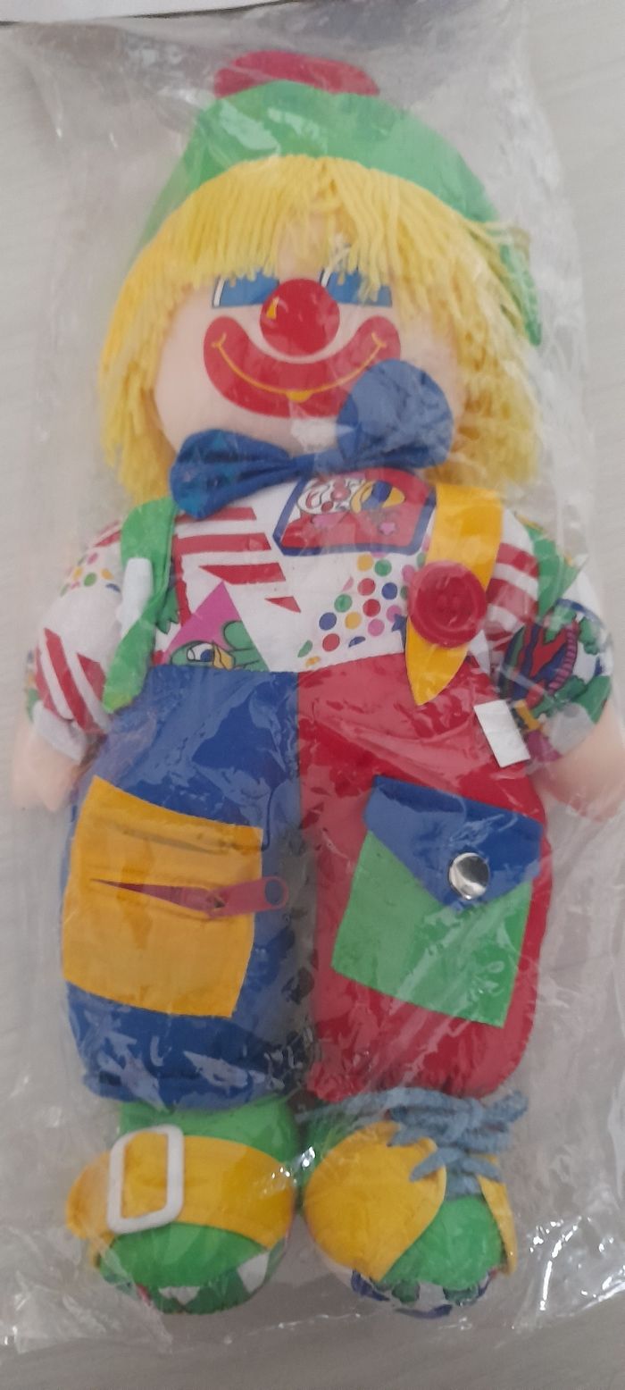 Clown d'activités A partir de 3 ans Pour apprendre à faire les lacets/ à attaché des boutons/ à utiliser une fermeture éclair etc ...( 8 fonctions) Peut être utiliser comme doudou En tissus Taille 40 cm environ Neuf encore dans son emballage d'origine