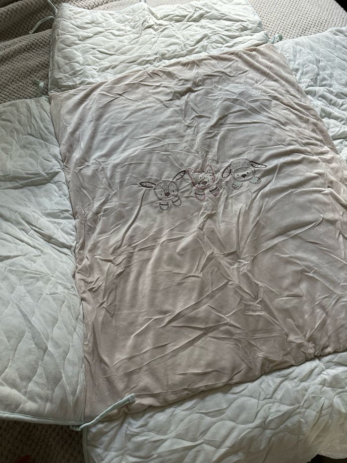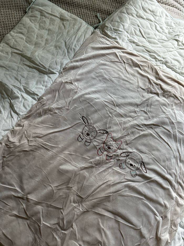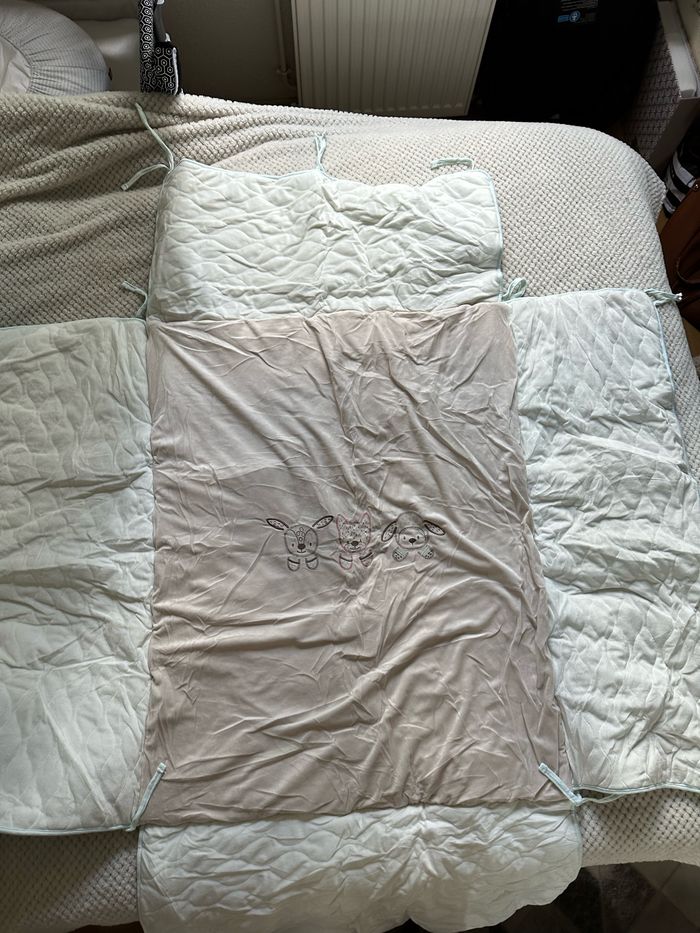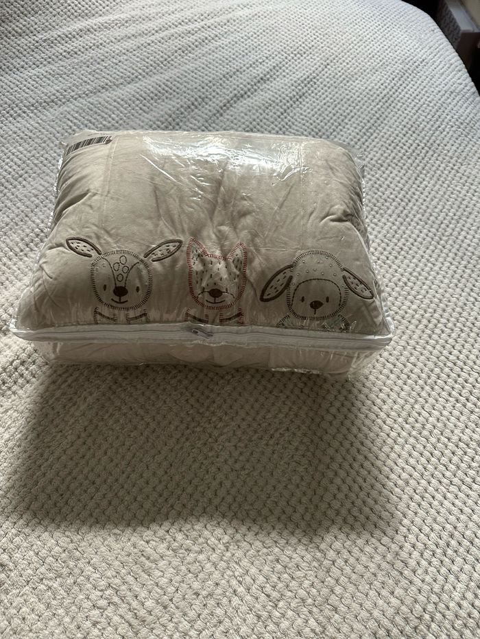 Dimension 75x95 cm Seulement lavé et stocké sous vide (d’où le froissement). Possibilité de faire un lot avec un prix préférentiel avec le tour de lit de la même collection dans mon dressing. Vendu encore 87€