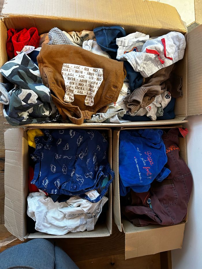 109 pièces de vêtements taille 12 mois Il y a de tout (salopettes, pantalons, bodies, hauts…) En bon état voir neufs pour certains