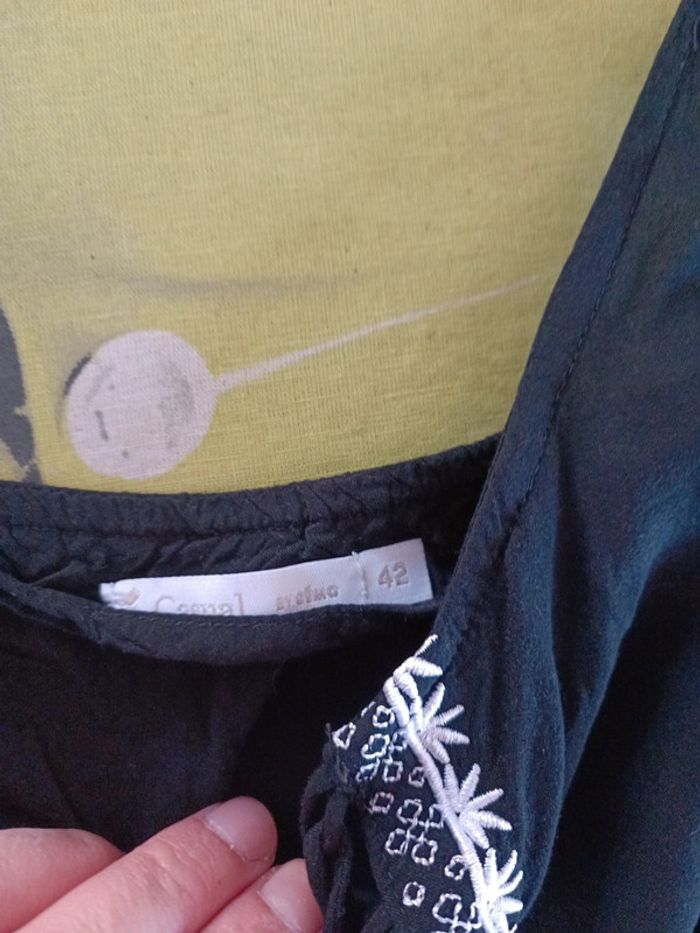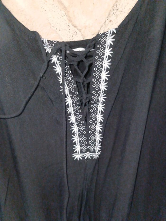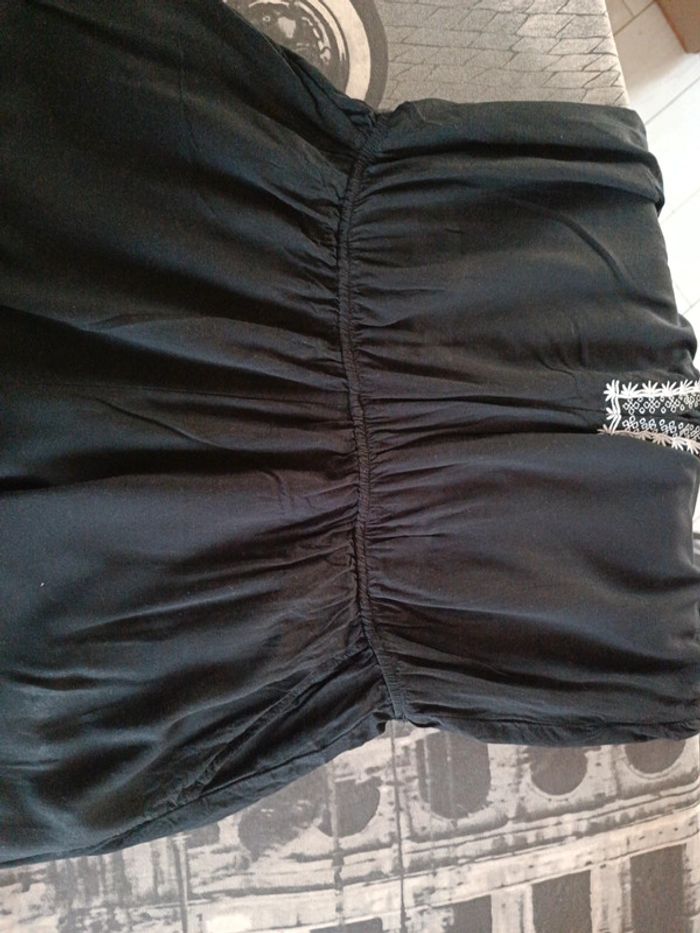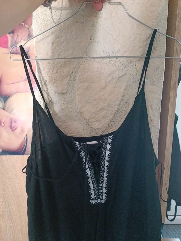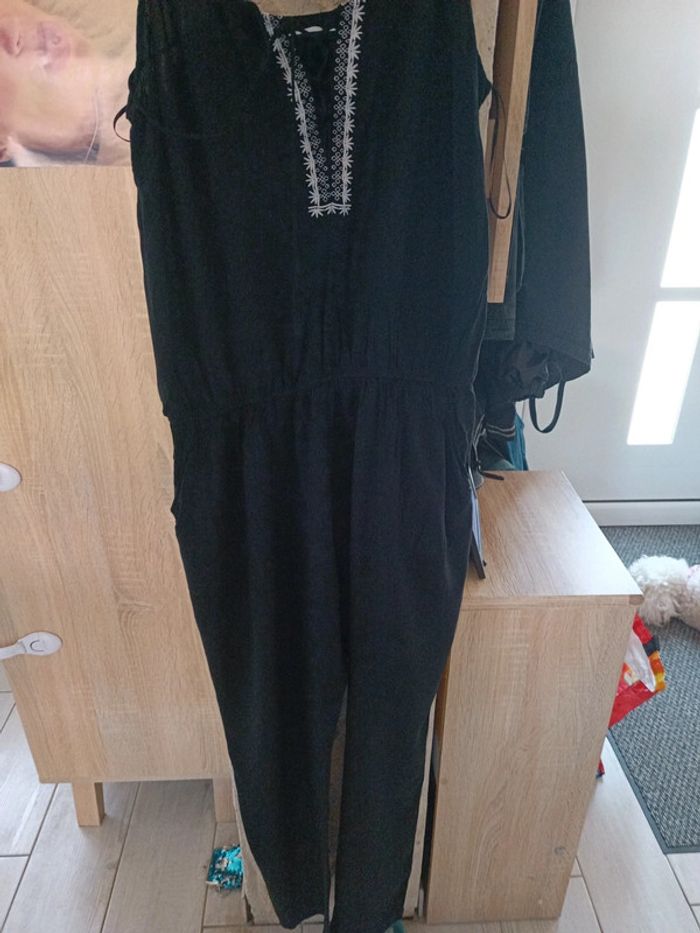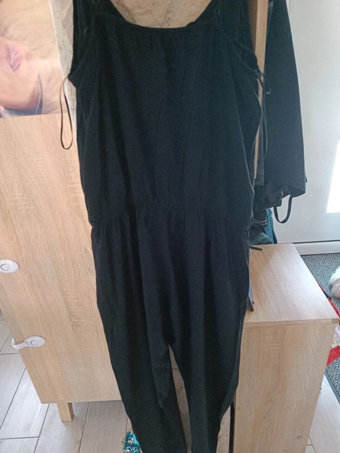 Combinaison pantalon Noire. Fines bretelles. Lacet devant avec poches. Portée une fois. Réductions si lot