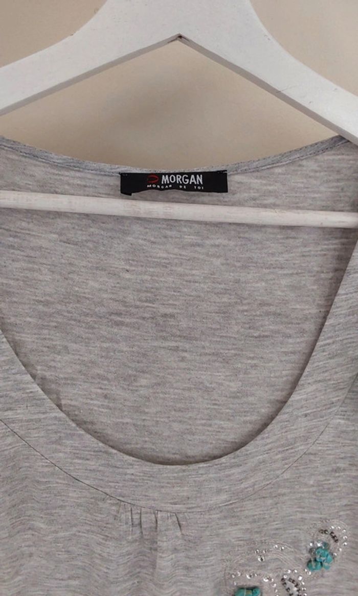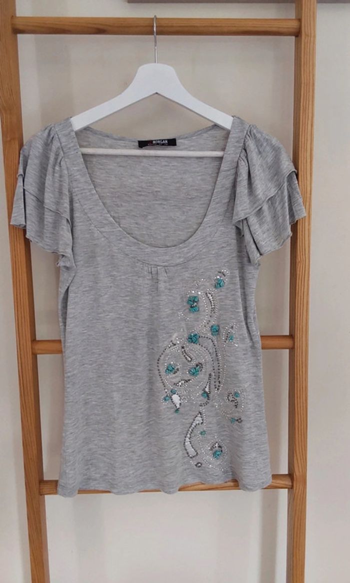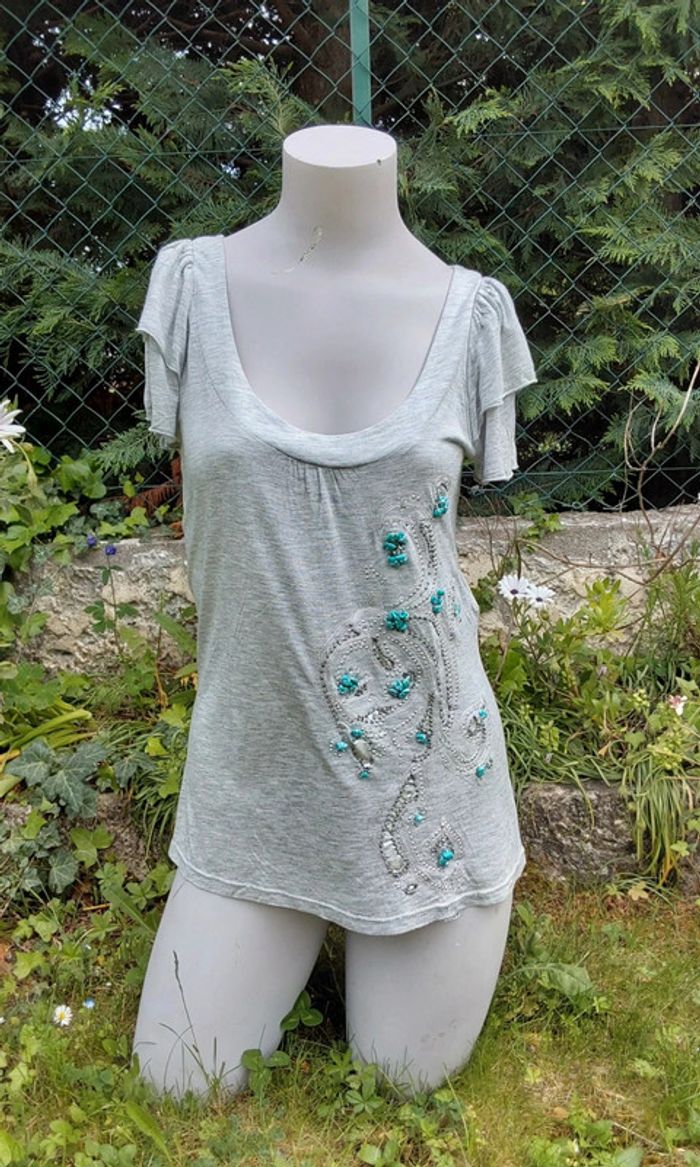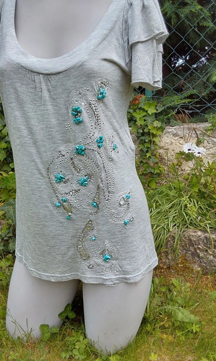 Très beau tee shirt décoré d une guirlandes de perles argentées, strass, pierres turquoises,...