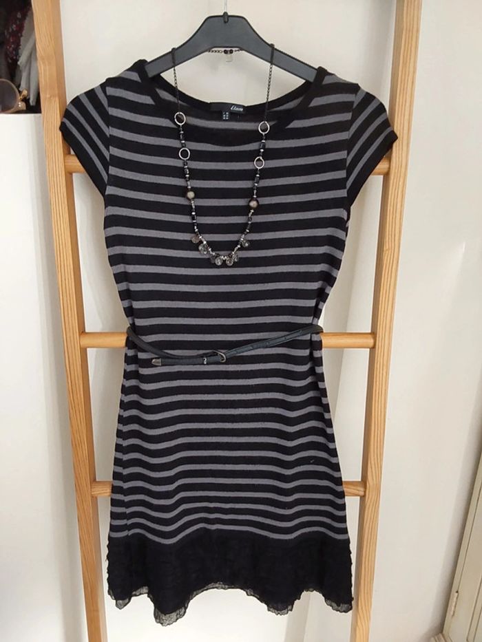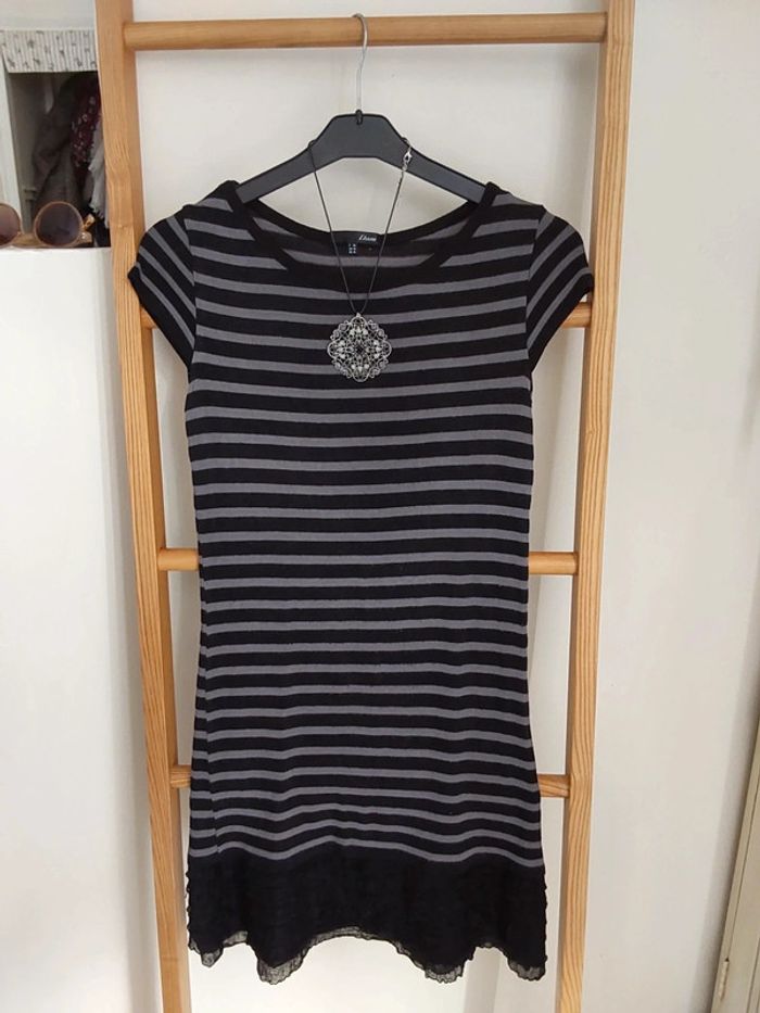 Robe noire rayée beige volant dentelle noire T 38 - photo numéro 2