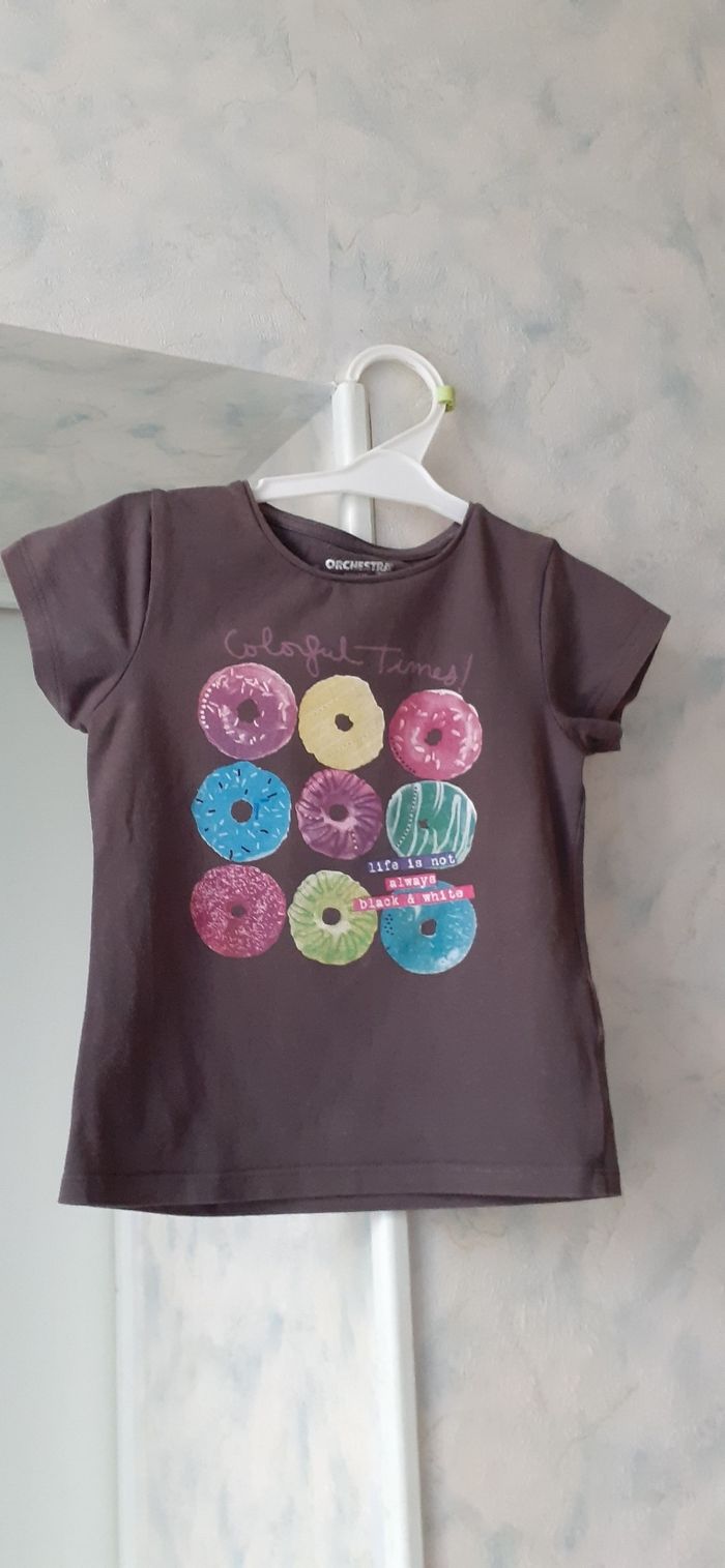 Vends un tee-shirt manches courtes marron foncé avec ronds multicolores marque Orchestra 6 ans sur l étiquette mais taille petit