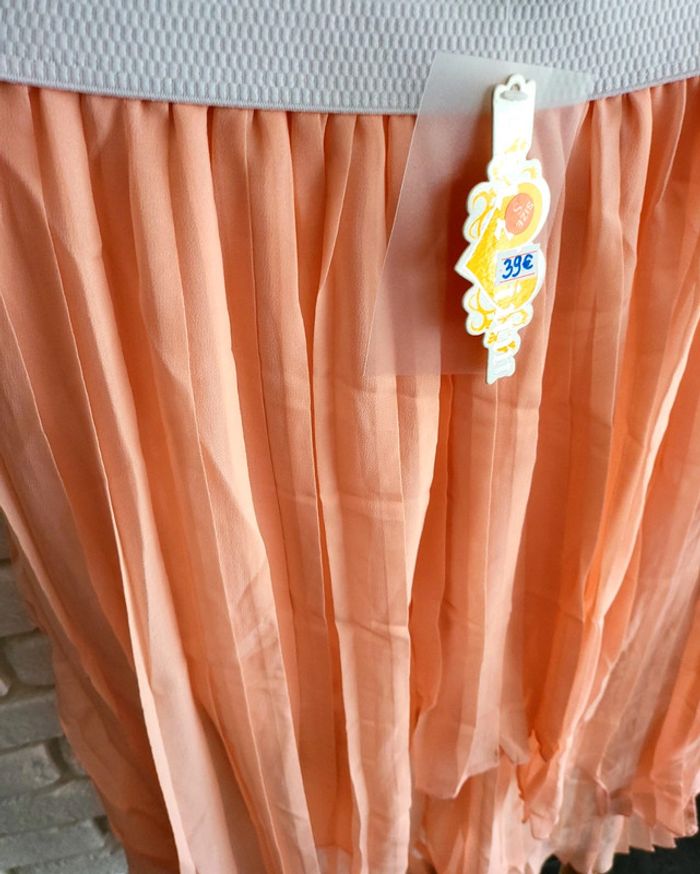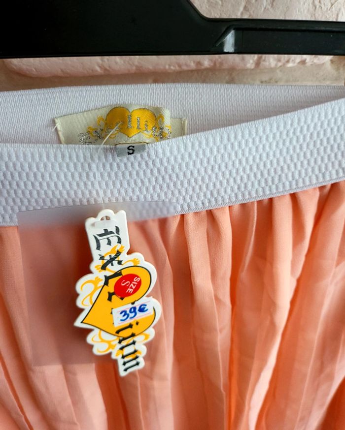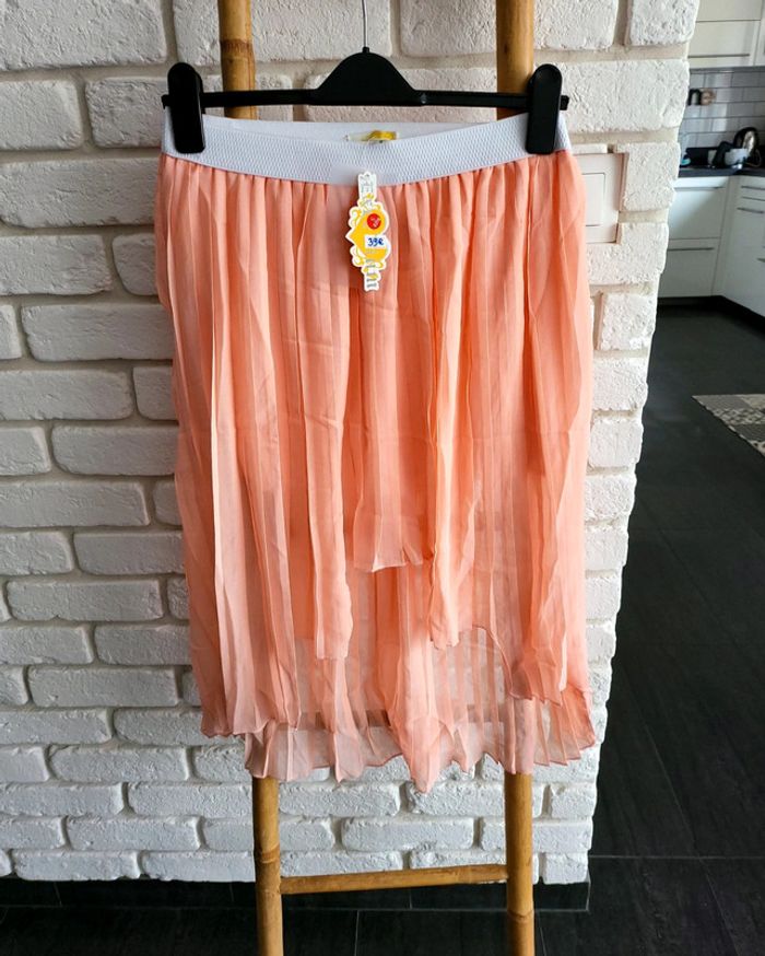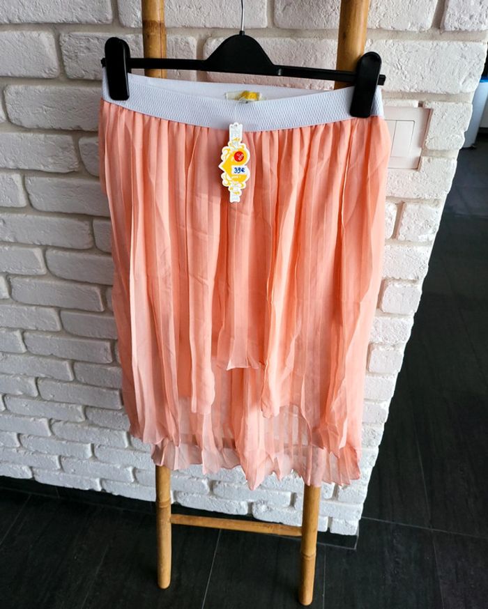 Bonjour à tous je vous propose cette très jolie jupe légère idéal pour la saison elle est de jolie couleur rose saumonée très lumineuse la taille est élastique ce qui permet de s'adapter à la taille SM et même un petit l n'hésitez pas si vous avez des questions je reste à votre entière disposition elle est neuve jamais porté avec étiquette pour info valeur 39 € acheté dans une boutique parisienne