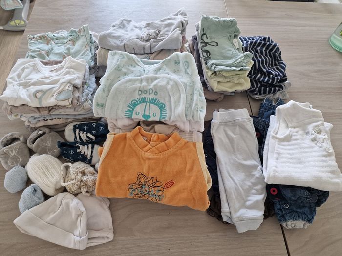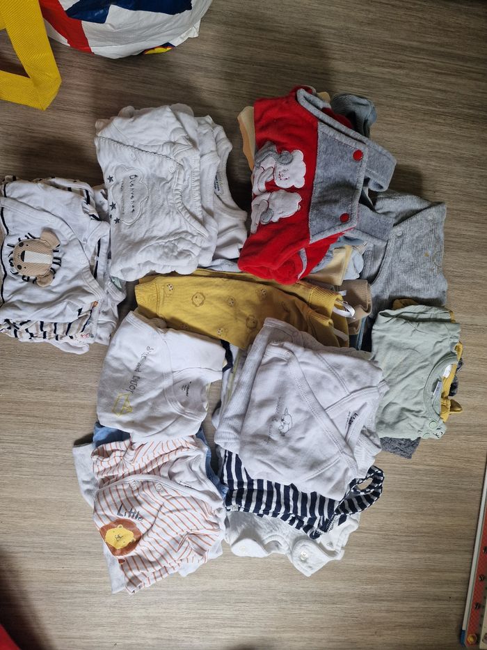 Lot de vêtements différentes marques (kiabi,disney,tape à l'œil, orchestra, verbaudet) 0 mois: - 5 body manche courte -16 body manches longues - 2 salopette - 4 combishort -8 pantalon - 10 pyjama chaud - 2 hauts - 3 pyjama léger 1 mois: - 4 salopettes - 3 pantalon - 10 haut -13 brassière - 15 pyjama chaud - 3 pyjama léger - 10 body - 10 bavoirs (j'en rajouterai une dizaine en plus)