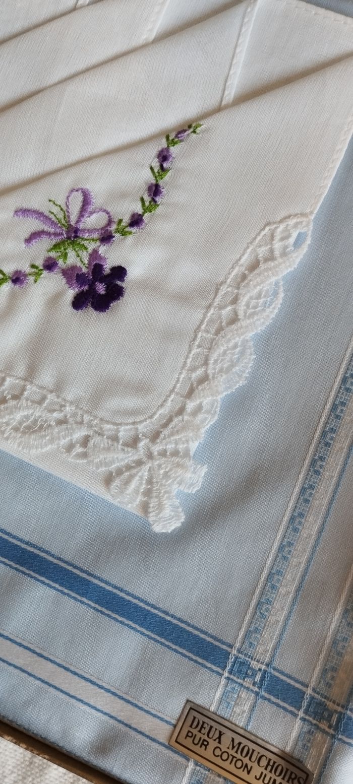 Boîte de 2 mouchoirs unisexe Coloris bleu 35x35 Coloris blanc, broderie lilas 25x25 Pur coton, made in Malaysia Neufs dans leur boîte d'origine.
