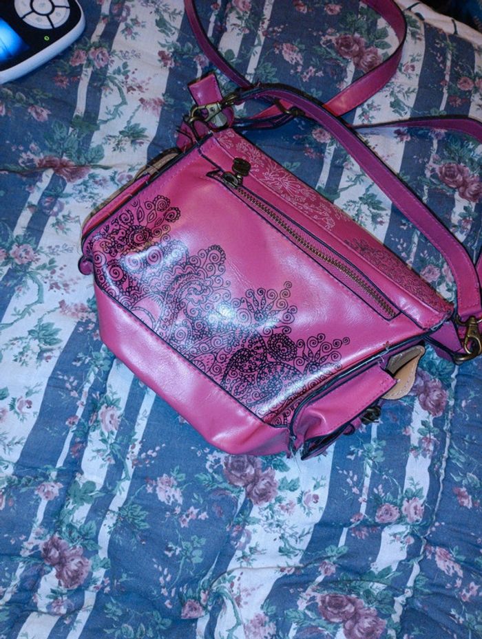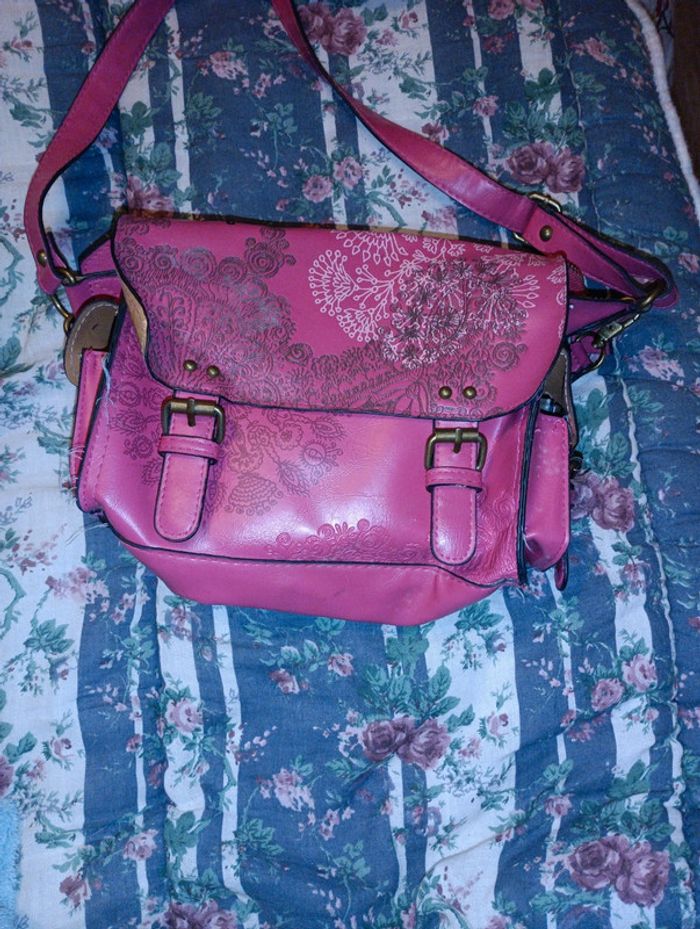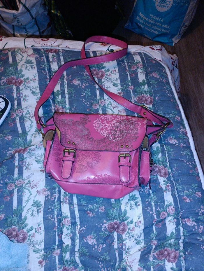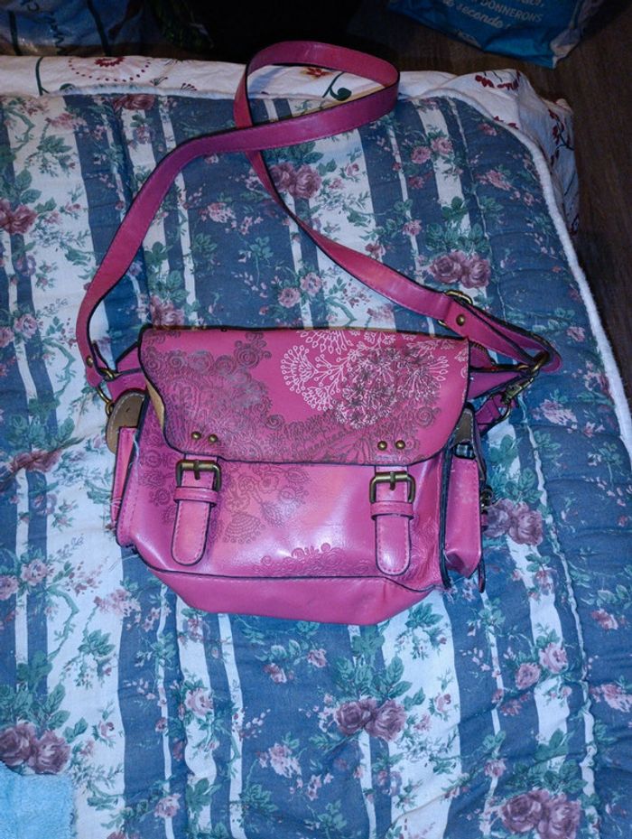 Joli petit sac bandoulière rose Desigual, En très bon état quelques légères griffures noires sur le cuir.