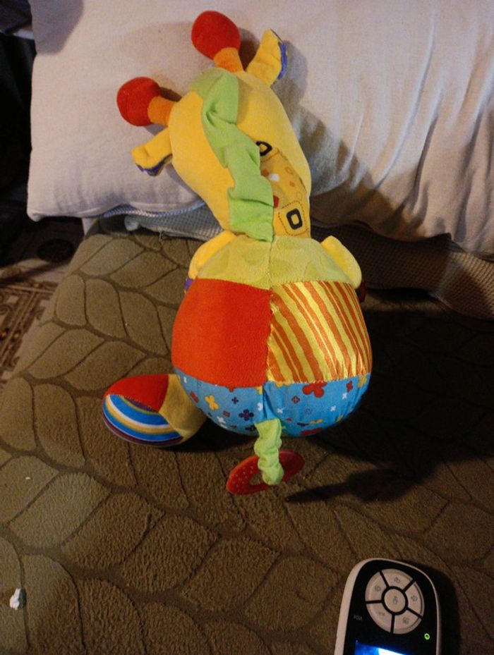 Peluche girafe d'éveil avec petits anneaux, miroir, tissus de différentes textures. En très bon état. Rarement utilisée.
