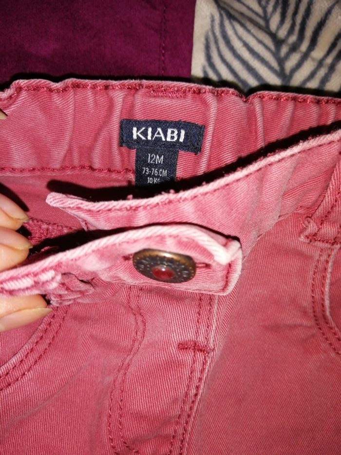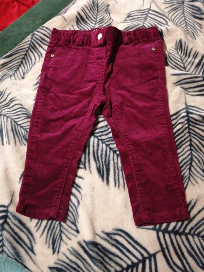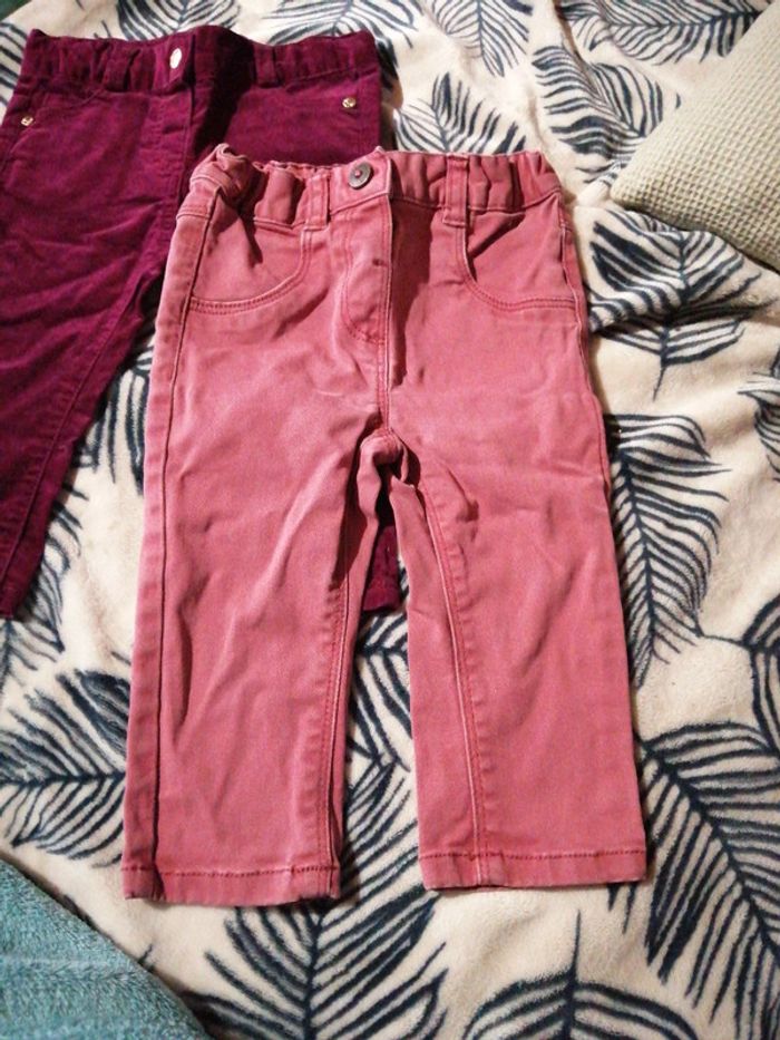 Lot de 2 pantalons : 1 pantalon slim velours bordeaux 12 mois, marque gemo, 1 jean marque kiabi, rose, 12 mois.