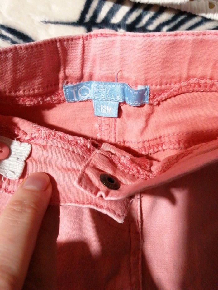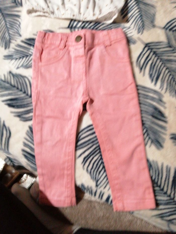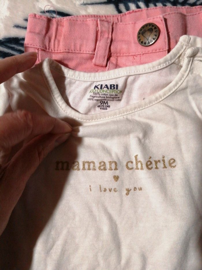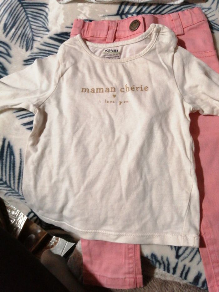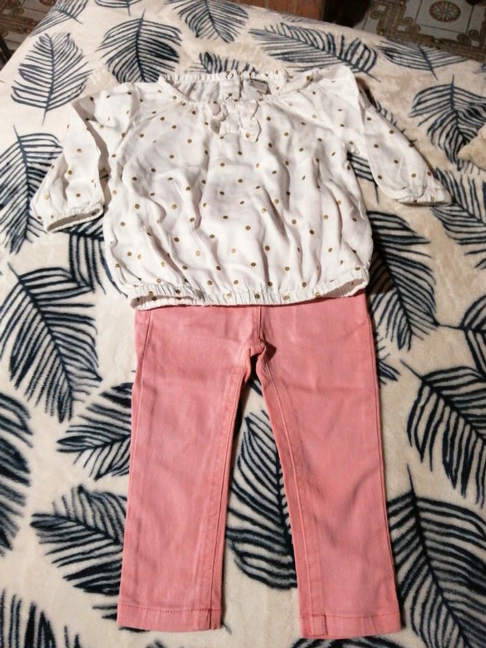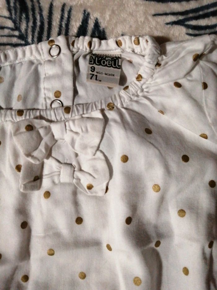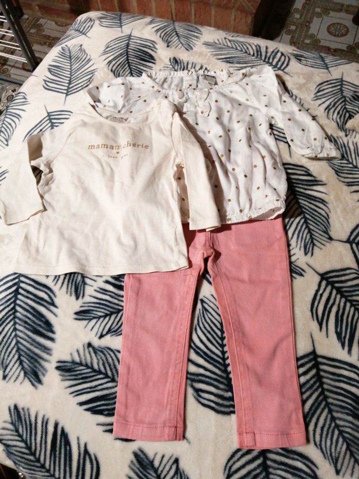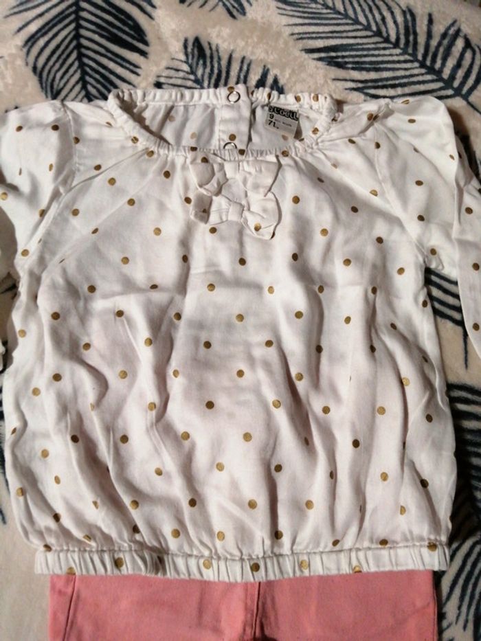 Joli petit lot bébé fille comprenant : - une blouse à pois dorés, tape à l'œil, taille 9 Mois 71 cm, - un tee shirt manches longues kiabi, taille 9 Mois 69-72 cm, - un jean rose tqf 12 mois