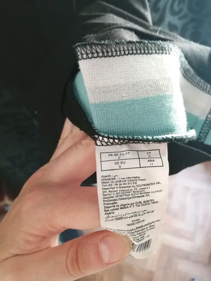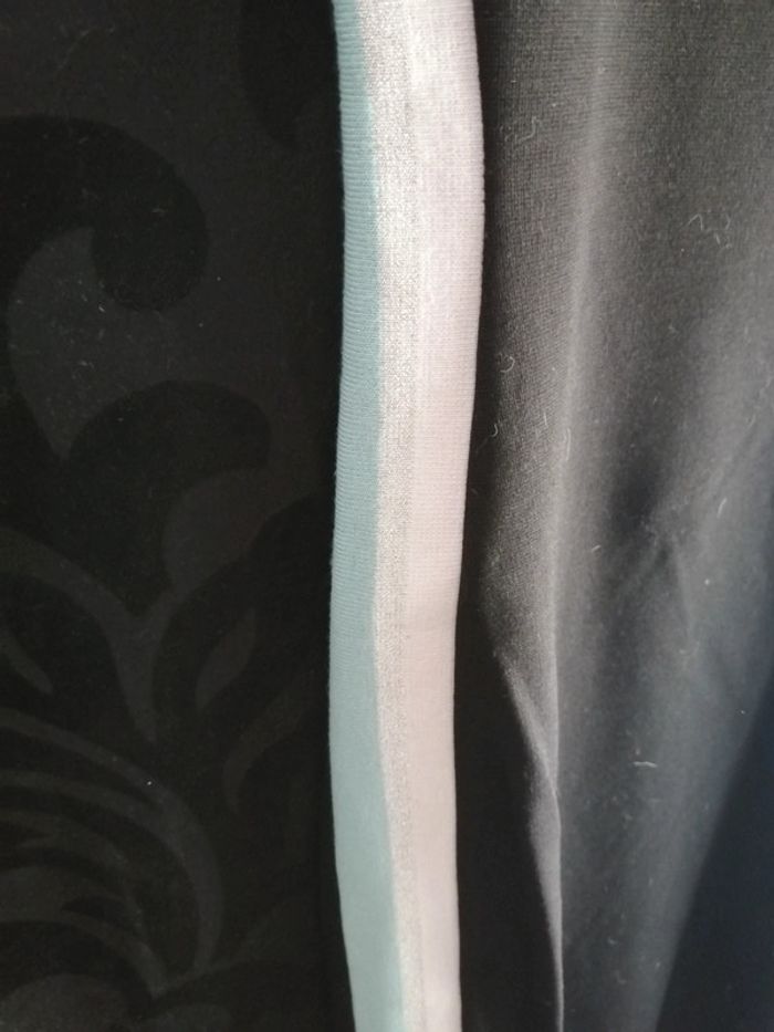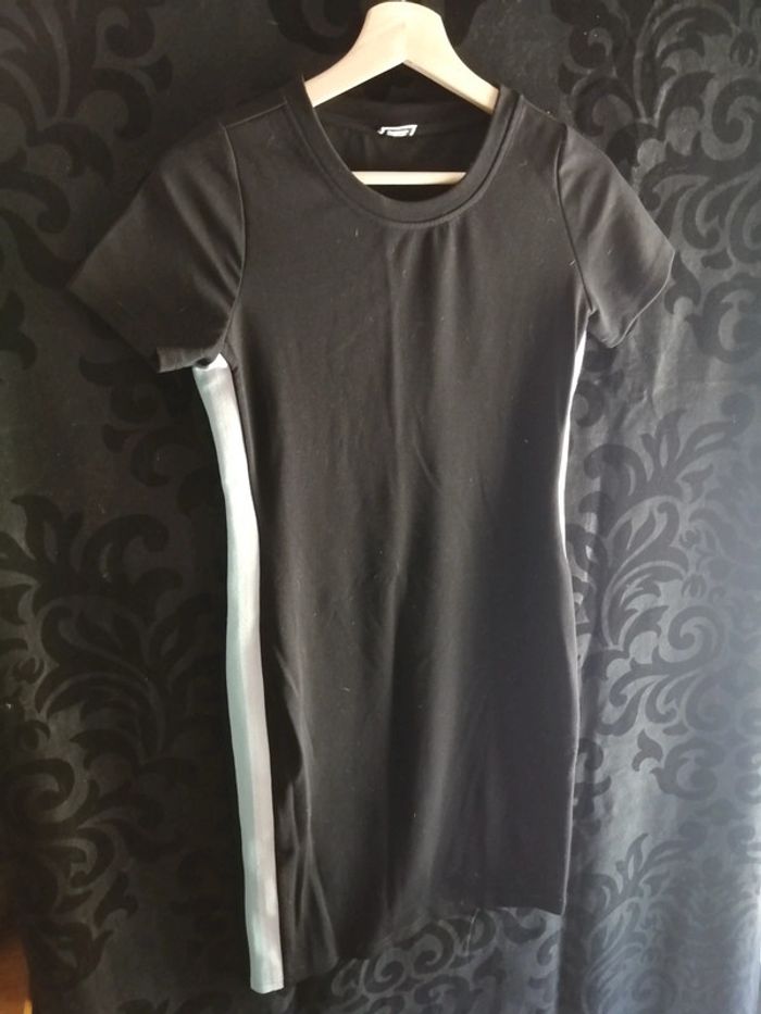 Petite robe noire moulante Avec lignes sur les côtés bleu clair, pailleté gris et blanc, Taille S Portée une fois