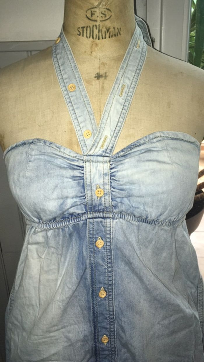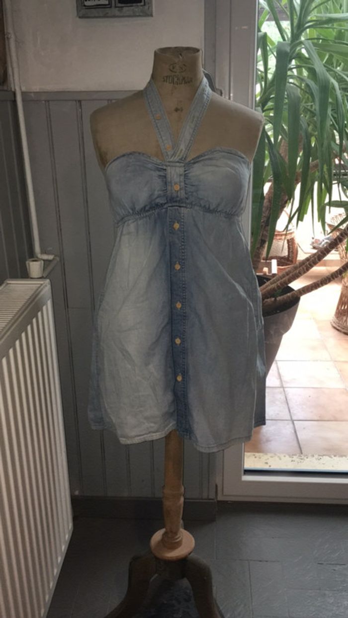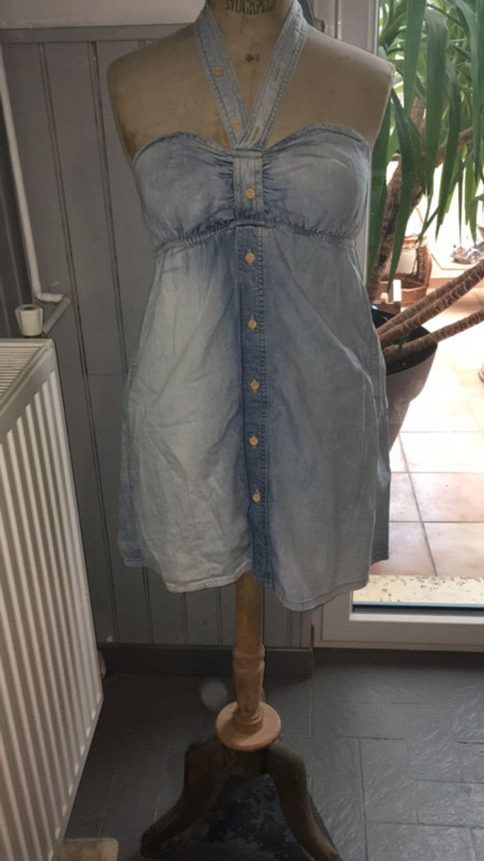 👗 jolie petite robe en jean 👗 idéale pour l’été 👗 décolleté en forme de coeur 👗 sangles à nouer autour du cou 👗 en très bon état, très peu portée