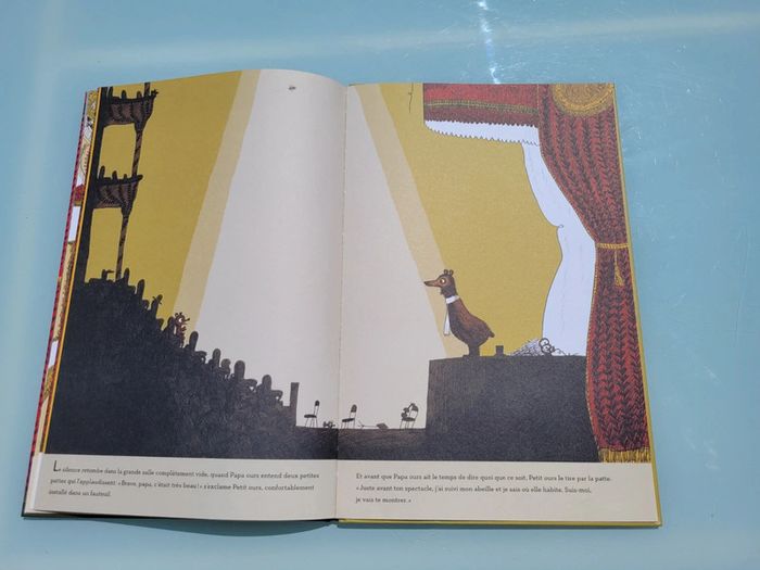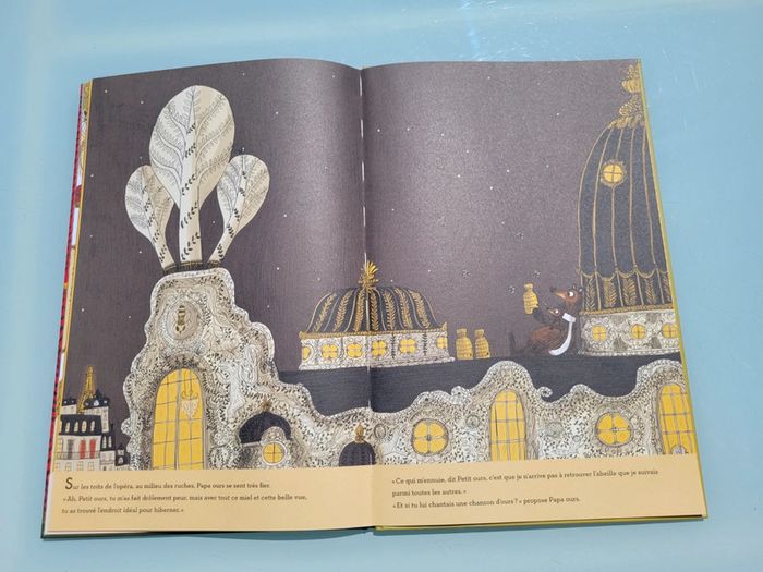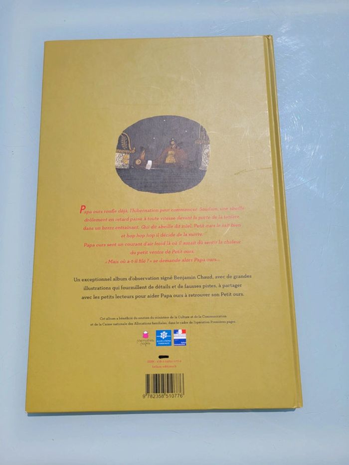 Petit ours et son papa commencent juste à s’endormir, quand une abeille très en retard file devant l’entrée de la tanière. Voilà Petit ours à sa poursuite ! Les choses se compliquent pour Papa ours, bien décidé, envers et contre tout, à retrouver son bébé… même si cela veut dire atterrir sur l’impressionnante scène de l’Opéra ! Au lecteur de chercher Petit ours dans des pages fourmillant de détails, de fausses pistes et d’humour. En très bon état Prix du neuf : 16.90€ Pour voir mes autres livres enfants : #livreenfantmooglou