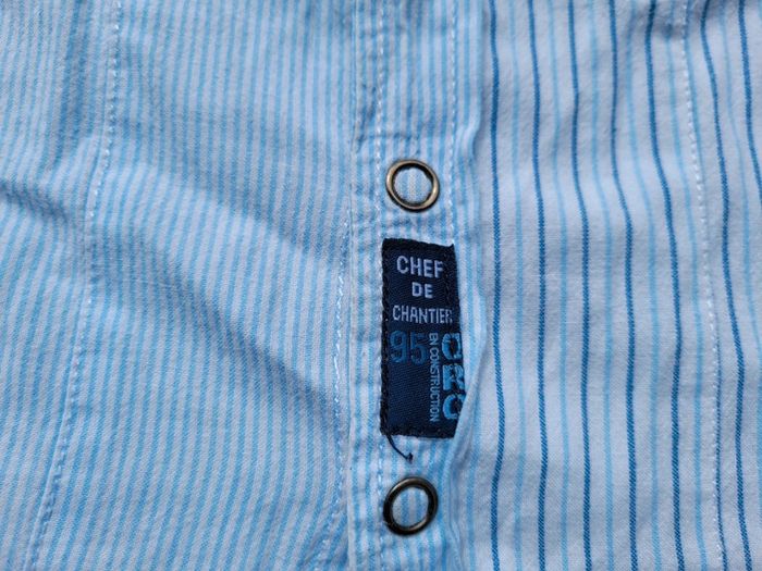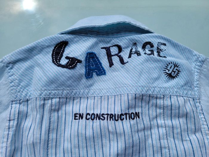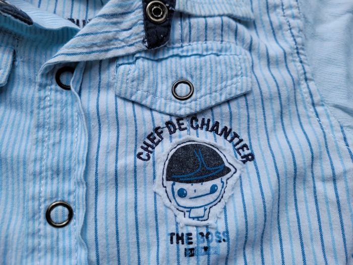 Très belle chemise de la marque Orchestra blanche à fines rayures bleues, manches longues, motifs chantier Taille 18 mois Très bon état Pour voir mes autres vêtements enfants : #18moisgarçonmooglou #orchestramooglou