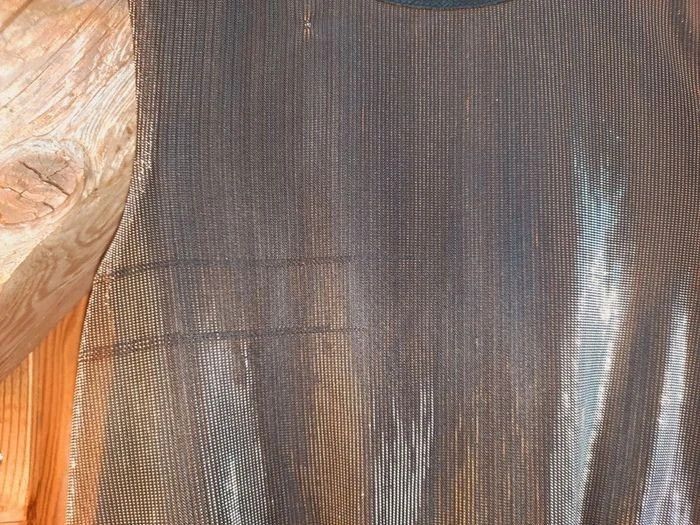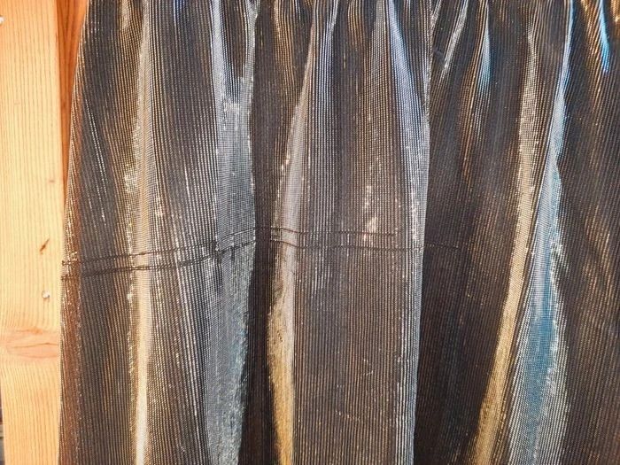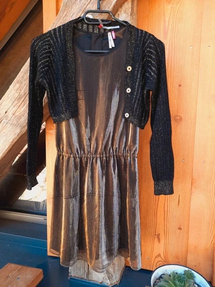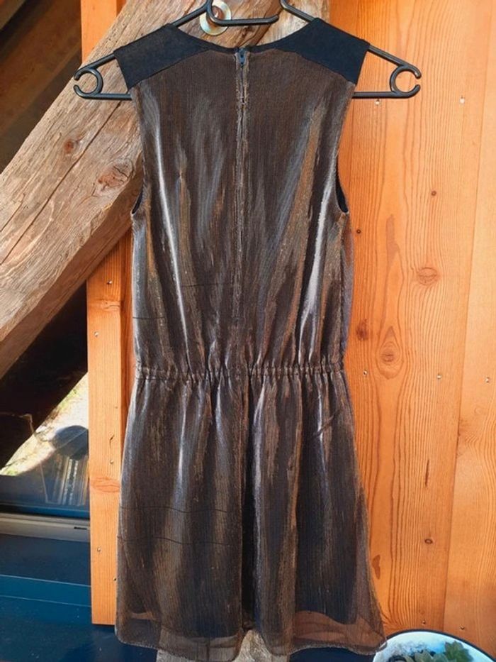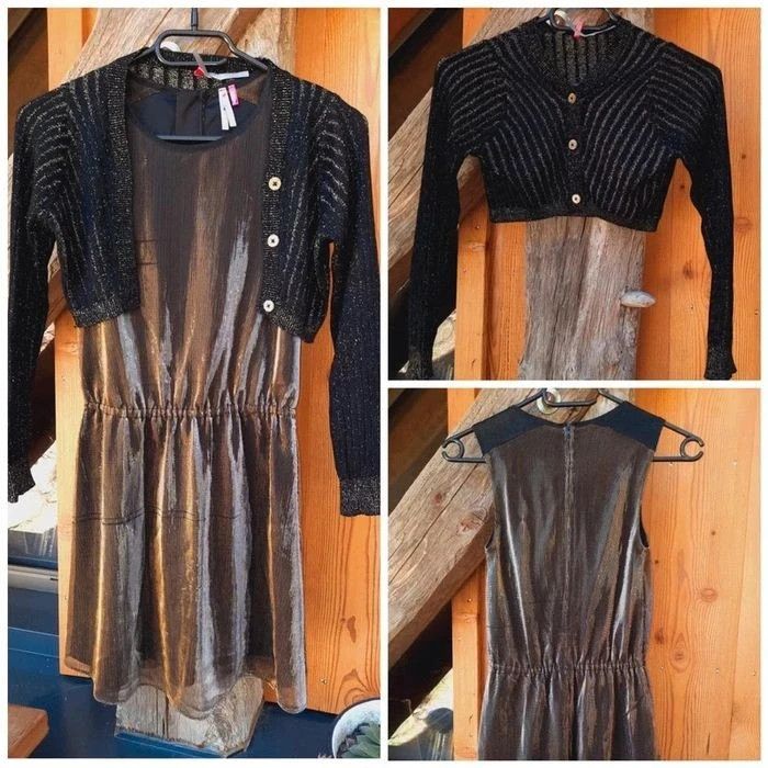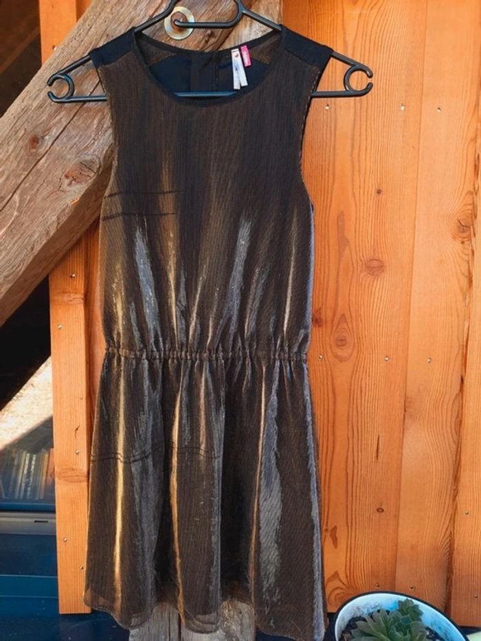 - une robe sans manche, fluide, en lamé dorée, cintrée à la taille, fermeture invisible dans le dos, vraiment très belle...quelques fils tirés mais reste superbe