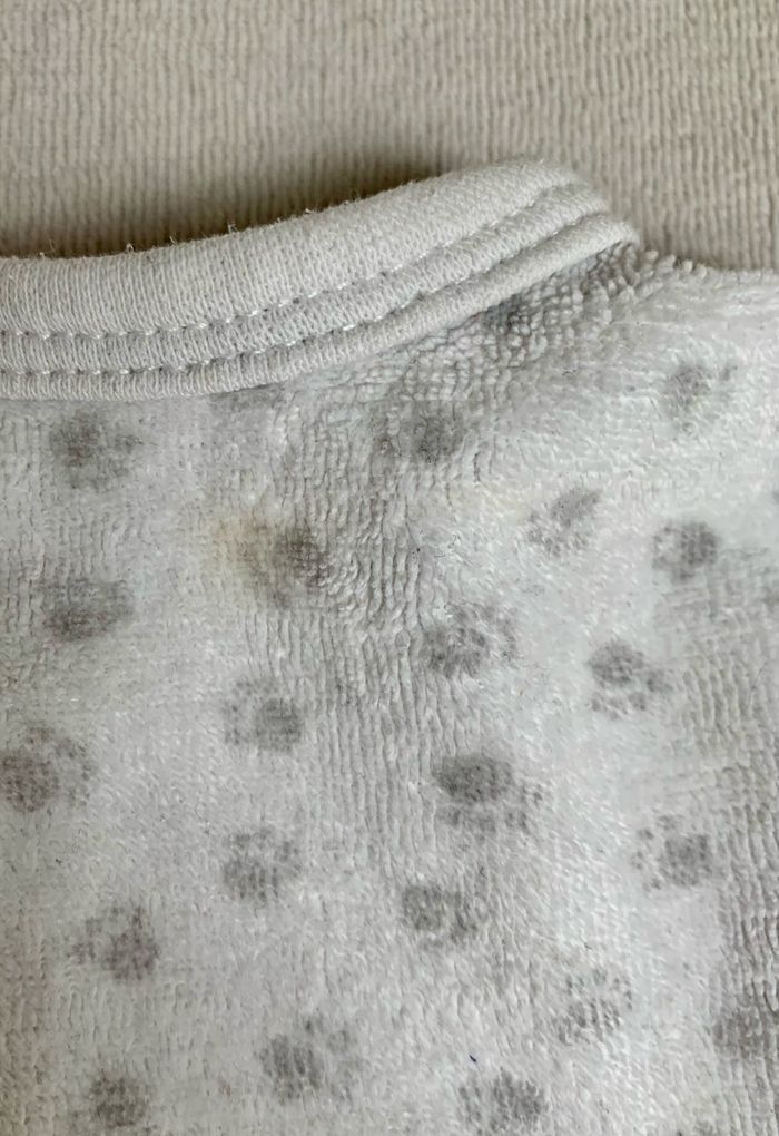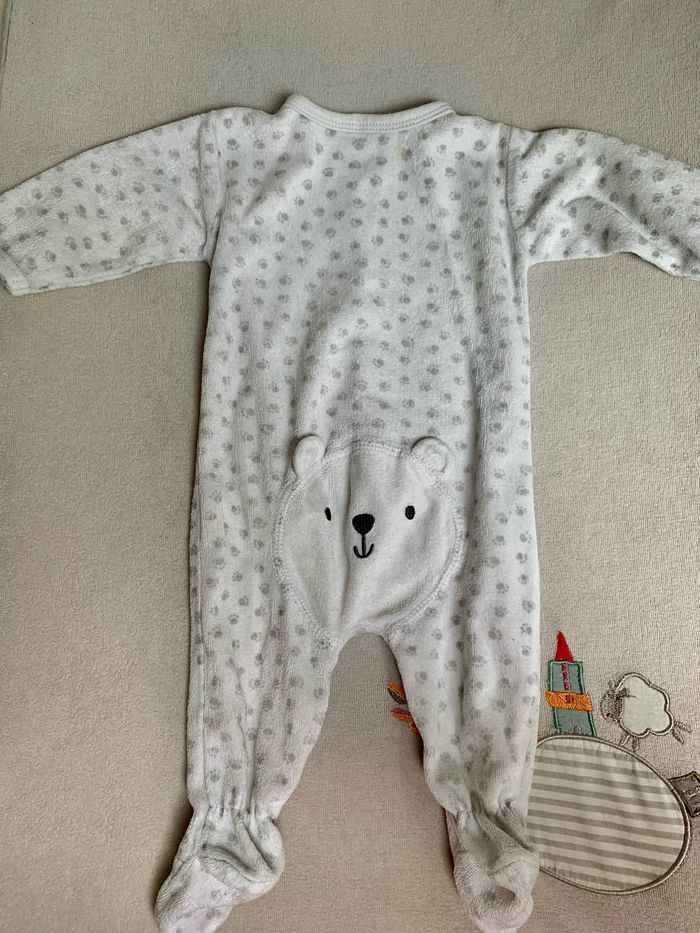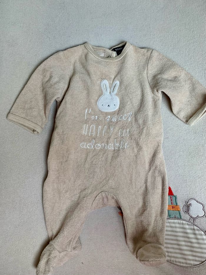 3 grenouillères bon état général. Un beige kiabi, un bleu extenso et un blanc zeeman (légère tâche qui partira au lavage- voir photo 4). 1-3mois