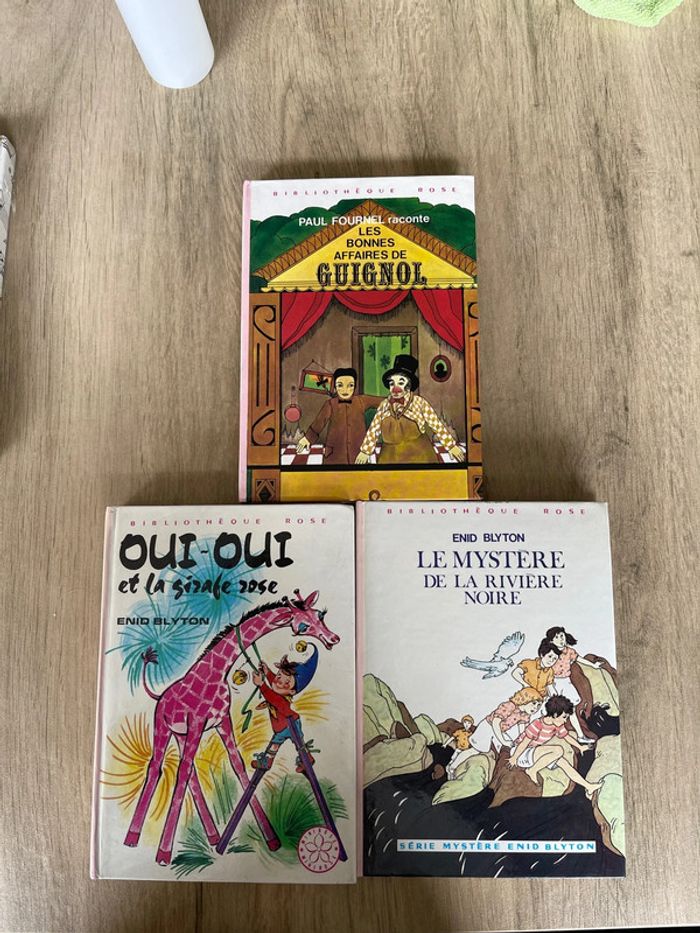 Livres anciens de la série bibliothèque Rose Bonnes affaires de guignols Oui oui, et la girafe rose Le mystère de la rivière noire Édition des années 79 En bon état pour des livres de plus de 45 ans