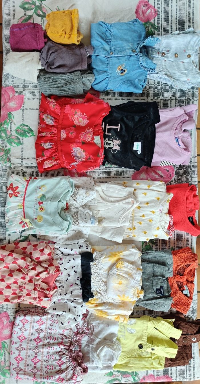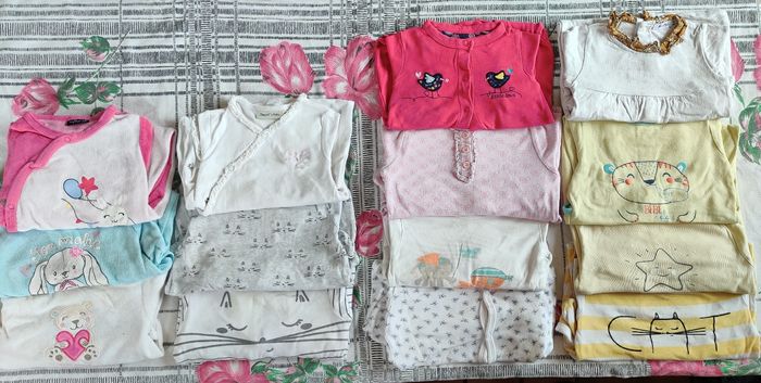 Colonne milieu gauche : En haut, 2 bodys à bretelles, beaucoup portés, un body MC, couleurs un peu passées.