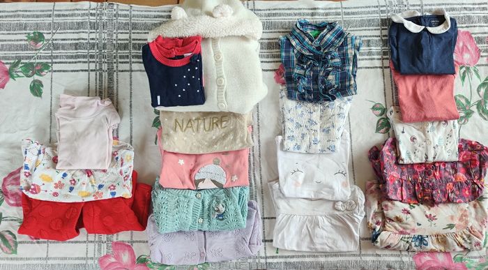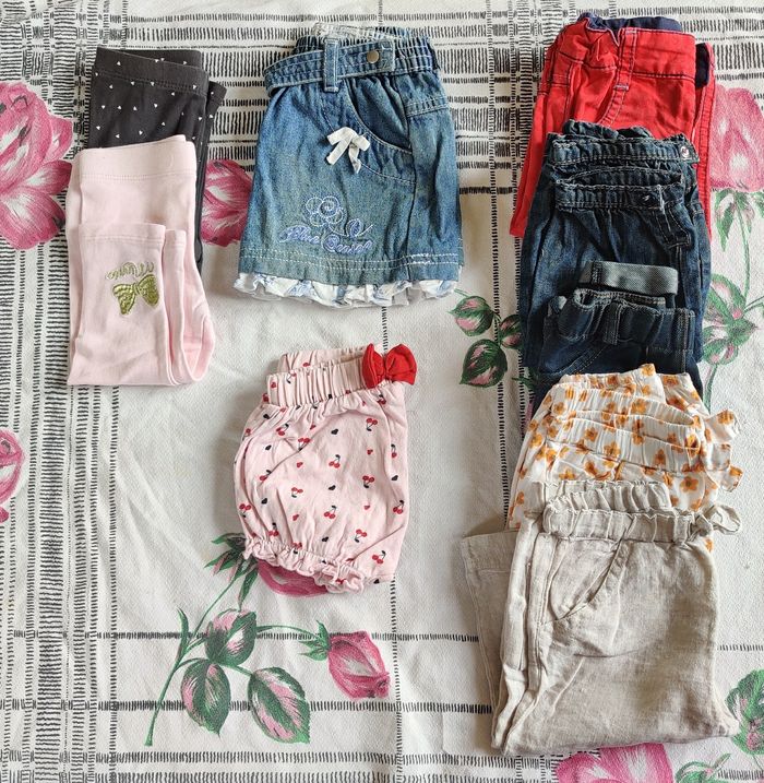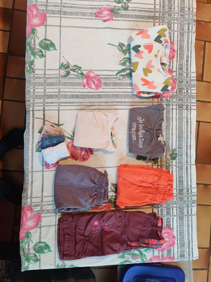 3 pantalons dont deux légers. 2 t-shirt ML, un pull et des chaussettes. Le tout en très bon état.