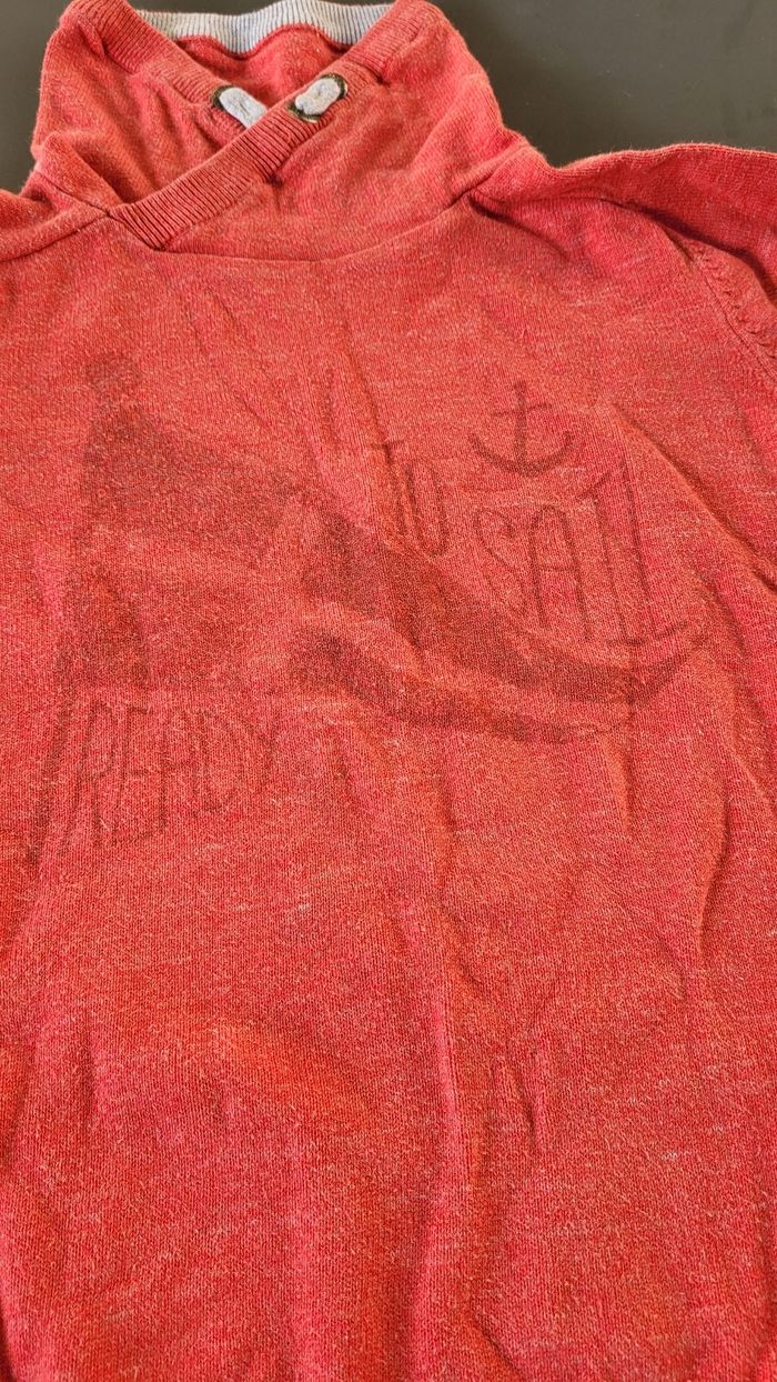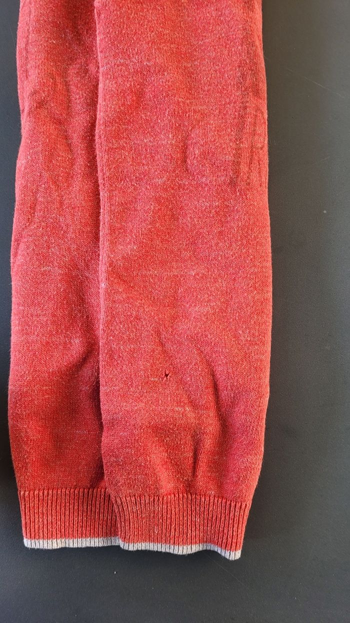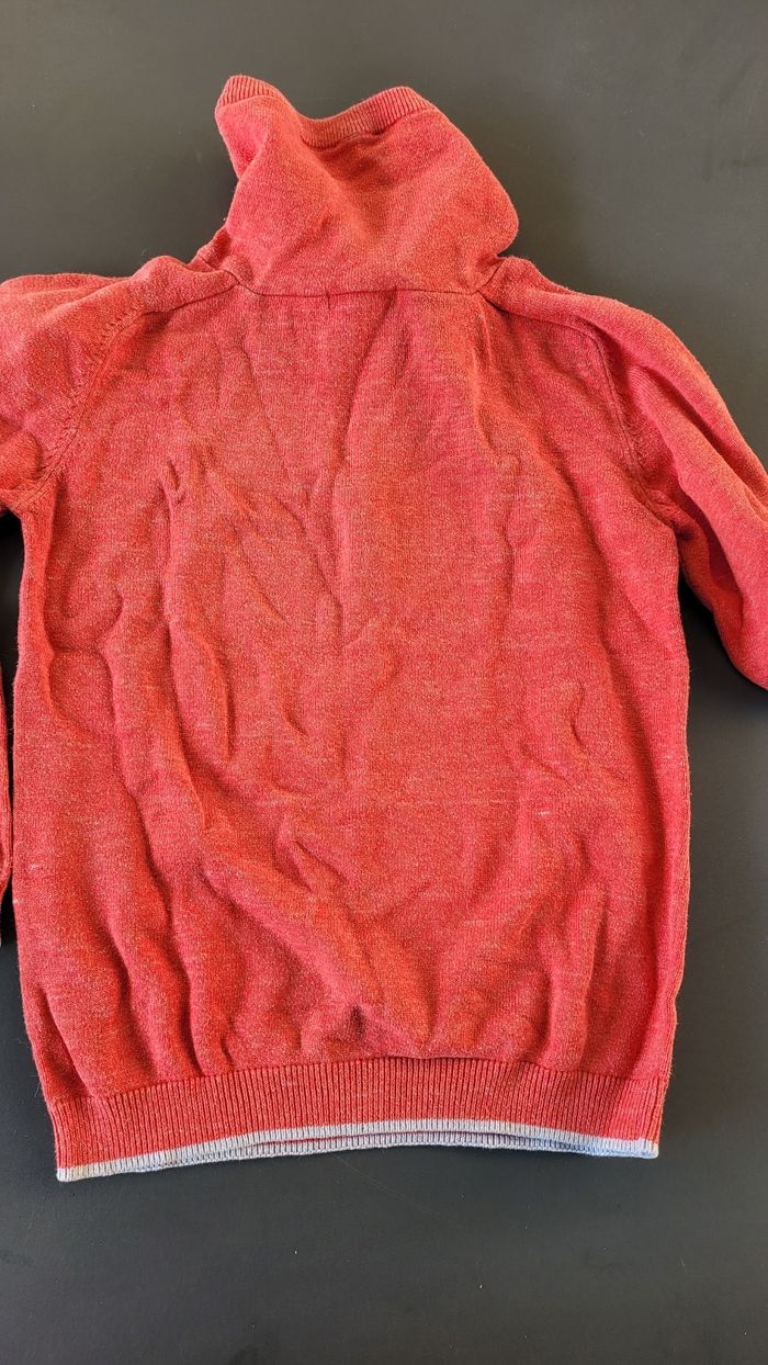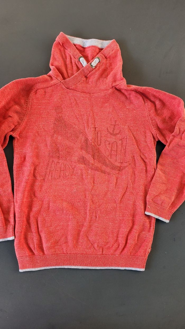 Pull rouge Okaidi 8ans col montant. Petit trou en bas à gauche.