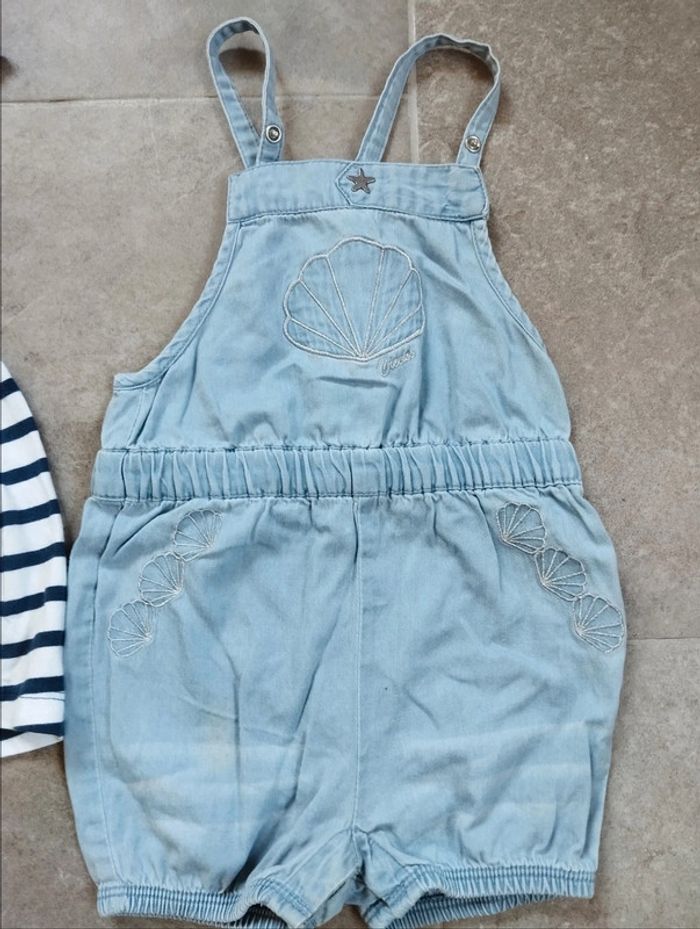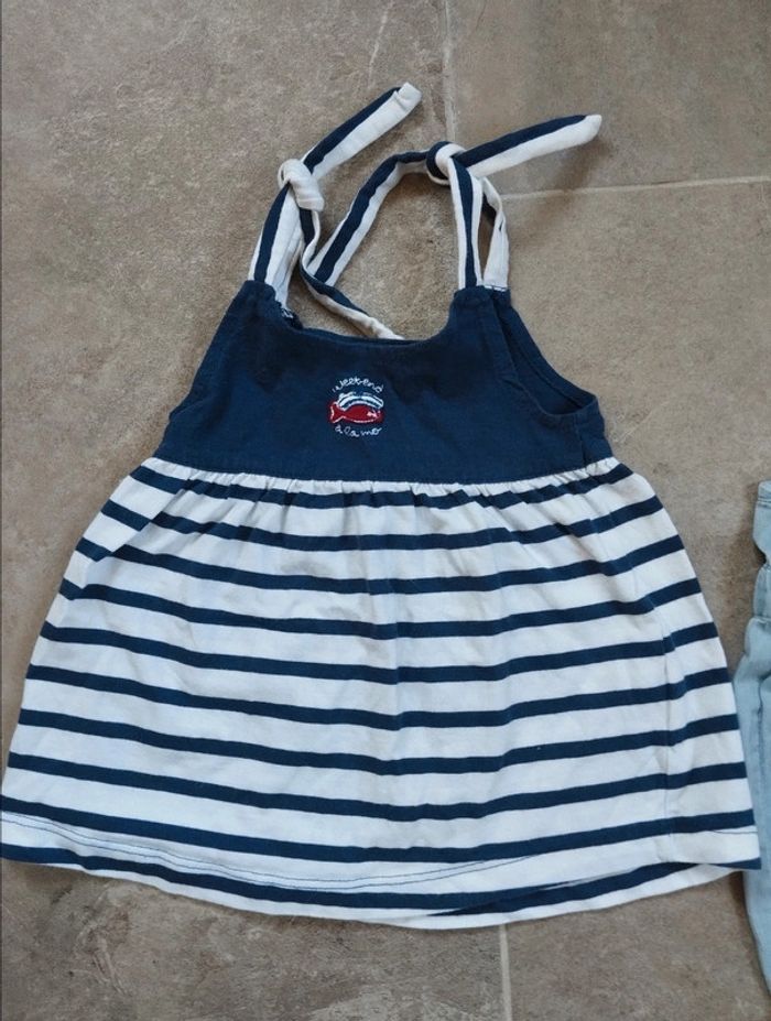 Lot de vêtements fille 18 mois comprenant : - une robe rayée bleue marine et blanc marque "week-end à la mer" - une adorable combinaison en jean bleu ciel avec des coquilles Saint-Jacques et une étoile de mer, marque Creeks Envoi rapide #vetementsfille18mois_charlillia