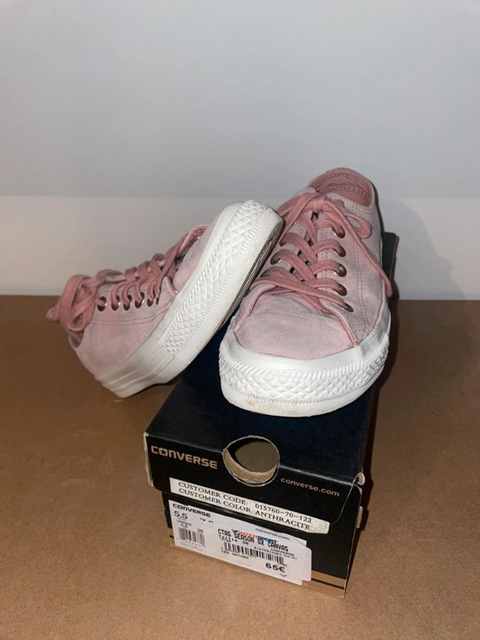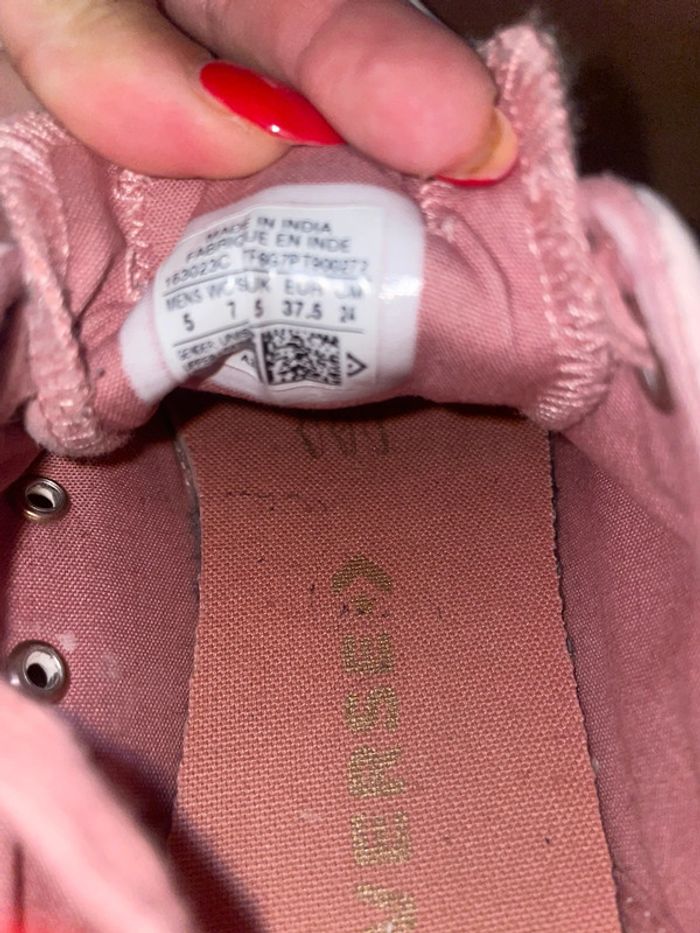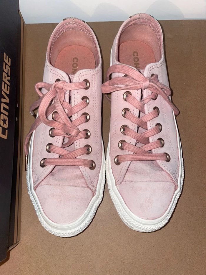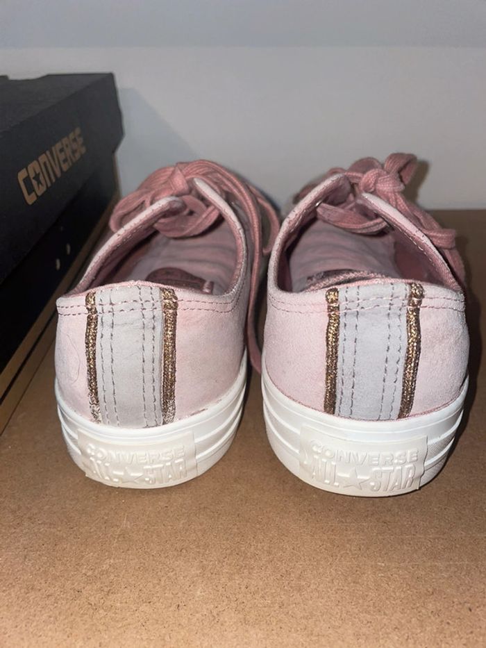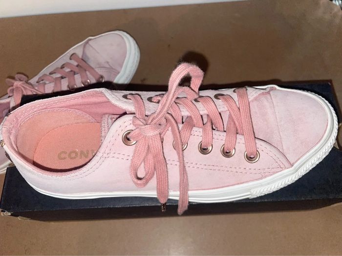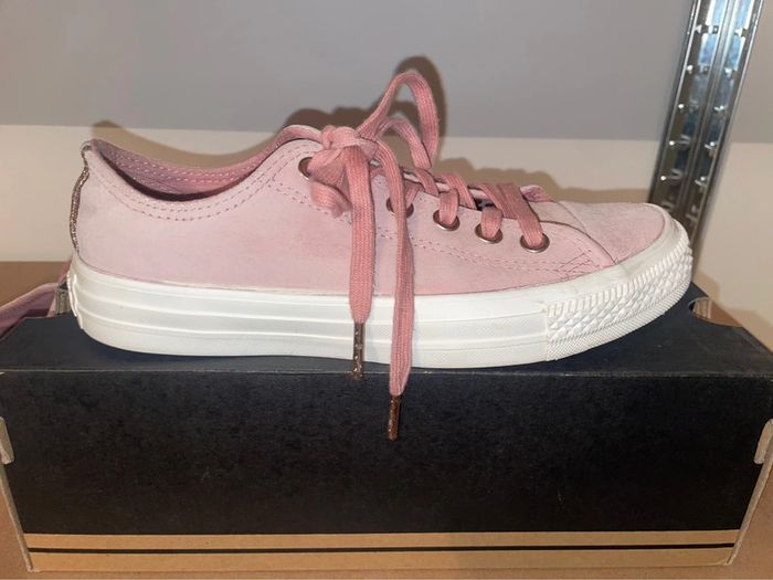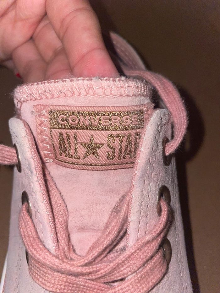Converse En Daim vieux rose, lacets épais finition dorée. L’arrière de la basket décor brillant/paillette. Très bon état - Portées que quelques fois. Taille 37,5. #converse