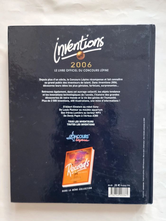 Inventions 2006 le livre officiel du concours Lépine En excellent état Depuis plus d'un siècle, le Concours Lépine récompense et fait connaître au grand public des inventeurs de talent. Dans Inventions 2006, découvrez leurs idées les plus géniales, farfelues, surprenantes... Retrouvez également, dans cet ouvrage collectif, les objets tendance et les innovations technologiques de l'année, l'histoire des grandes découvertes de notre monde et la vie des génies de l'humanité. Plus de 2 500 inventions, 600 illustrations, une mine d'informations ! D'Albert Einstein au robot Sony, De Louis Pasteur au meuble aquarium, Des frères Lumière au lecteur MP3, De Denis Papin à l'Airbus A380. Tous les inventeurs, toutes les inventions. #angel_livre_adulte_société