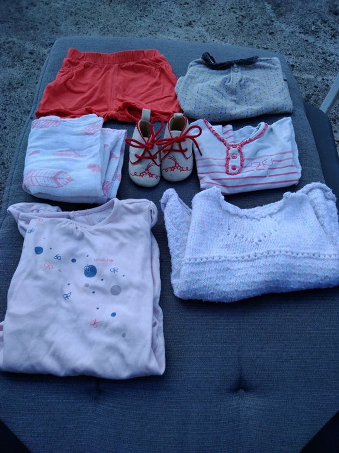 Lot 6 mois comprenant un pyjama, une paire de chaussures, une écharpe ou petite couverture, un gilet, un tee-shirt manches courtes, un tee-shirt manches longues, un short. Différentes marques. #in extenso #obaibi #graindeblé #brioche