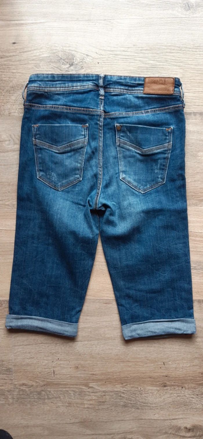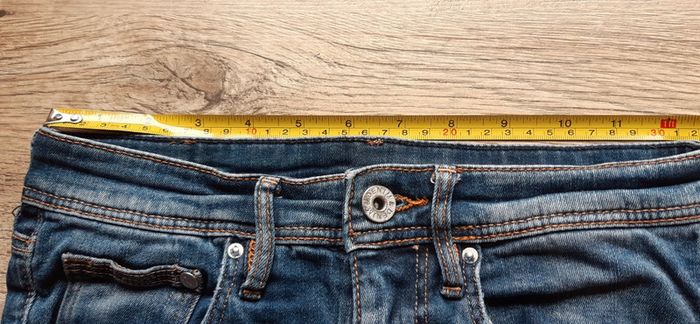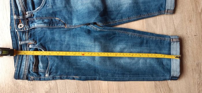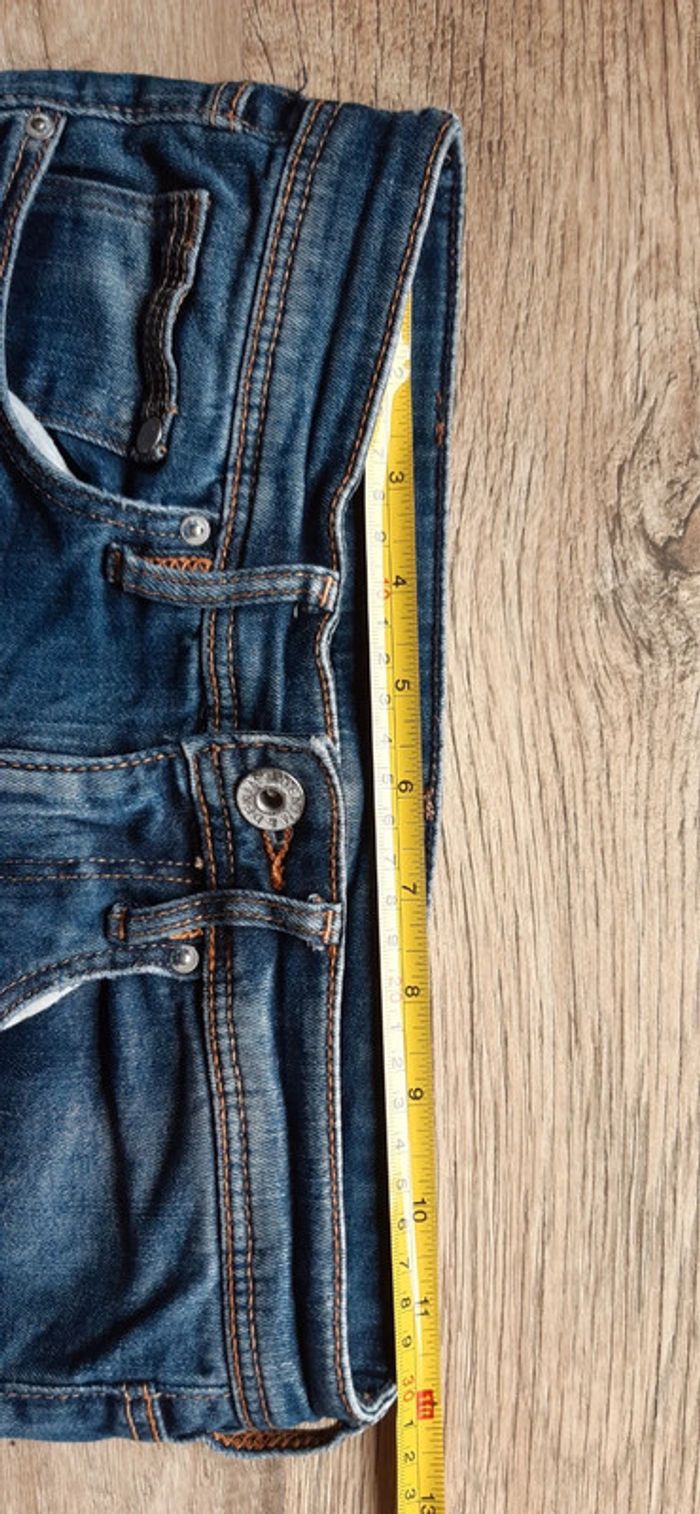 Taille petit L etiquette indique un 34 ou 160, légèrement extensible. Ma fille l a porté comme un 12-14 ans Environ 64 cm de tour de taille, 50 cm de bas en haut 90% coton et 8+2% de matière "elastique" Les traces "d usure" sont d origine faites exprès comme c est à la mode actuellement
