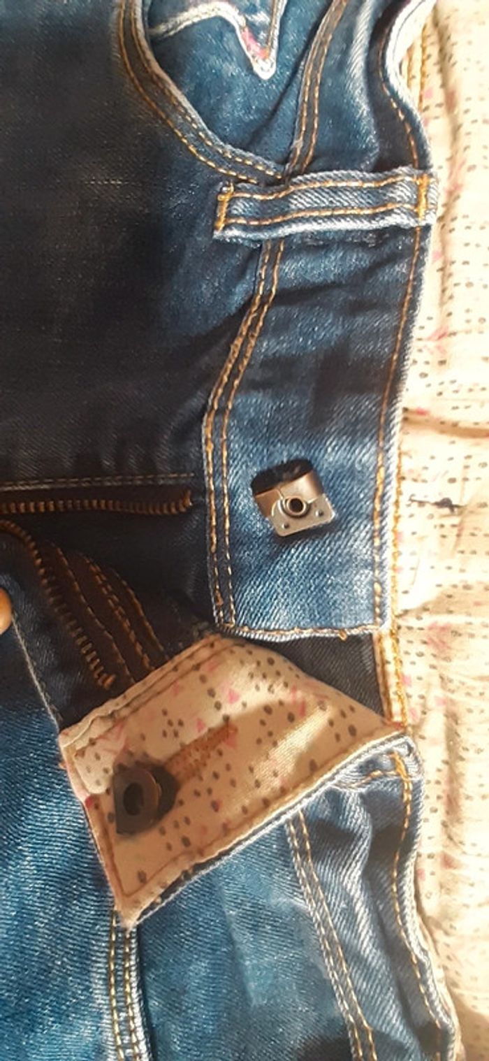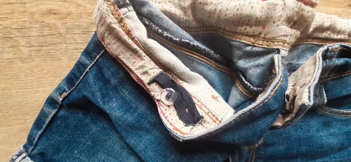 Très joli liseret à l interieur Réglable à la taille. 152 cm Joli détail étoile sur la poche. Fermeture pratique par un "crochet" . A été porté (petite tâche à peine visible -photo 4 - et légère usure sur poches arriéres) mais c est ce qui fait don charme.