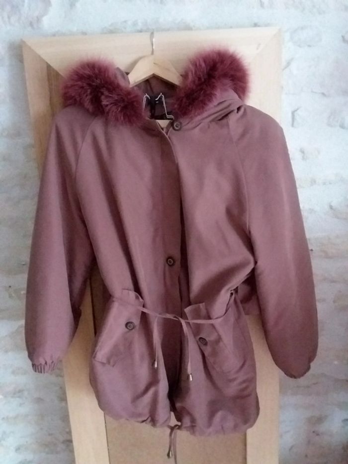 Manteau doublé. Plusieurs épaisseurs donc idéal en mi saison. Je pense que c'est l'équivalent d'un 48. N'hésitez pas à me demander les dimensions.