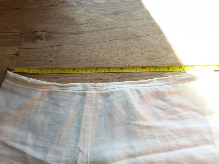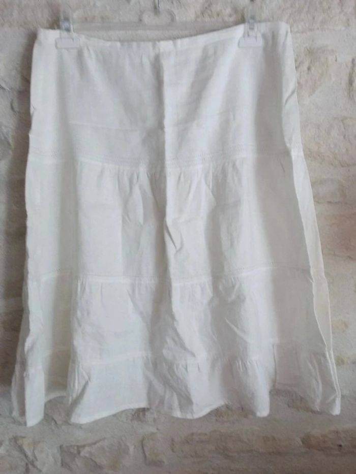Agréable jupe blanche. Je n'ai plus les étiquettes mais je pense que c'est une taille 42 et qu'elle est composée de lin. Environ 45cm de large avec une fermeture. 69 cm de longueur.