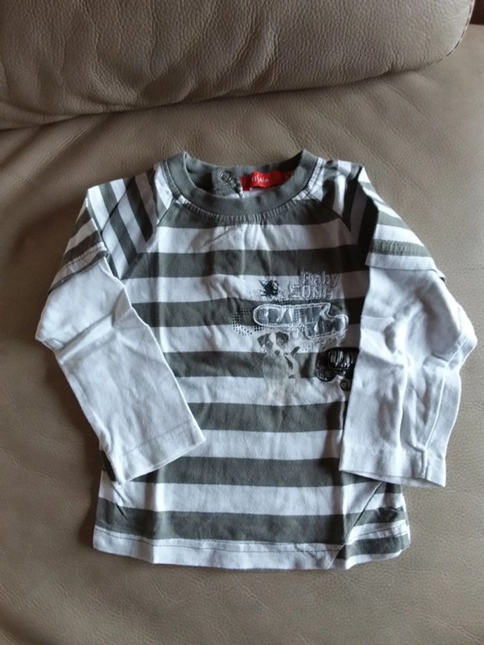 Tee-shirt effet 2 en 1 rayé blanc kaki 6 mois Boutons pression à l'arrière.