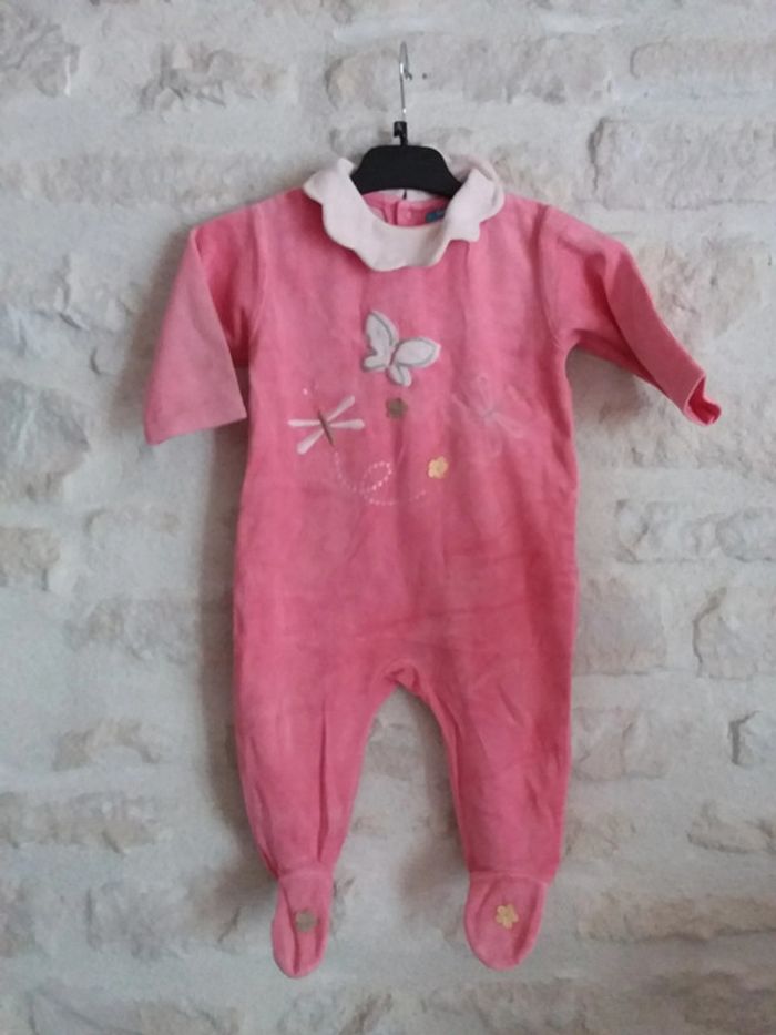 Pyjama velour rose 12 mois avec broderies et fleurs en relief et collerette