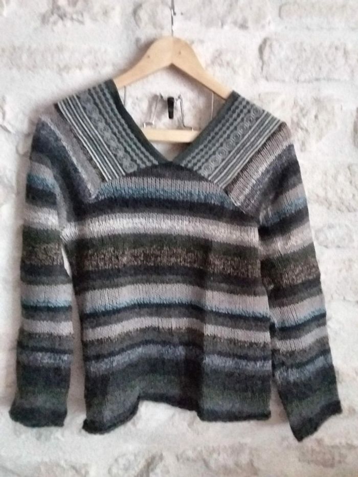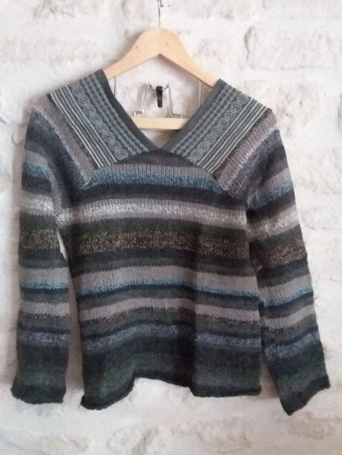 Pull nuances de bleu vert et gris 37% de laine et 15% d'alpaga taille 1