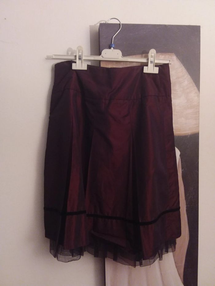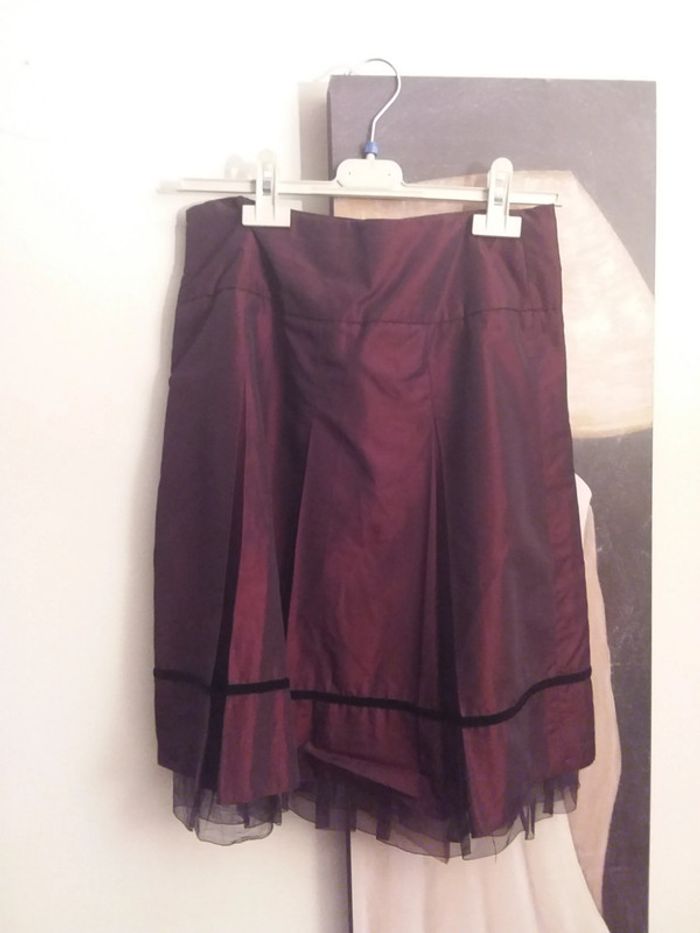 Jolie jupe brisée dans les tons prune/ bordeau et petit volant noir en bad et un liseré noir velour Taille 38