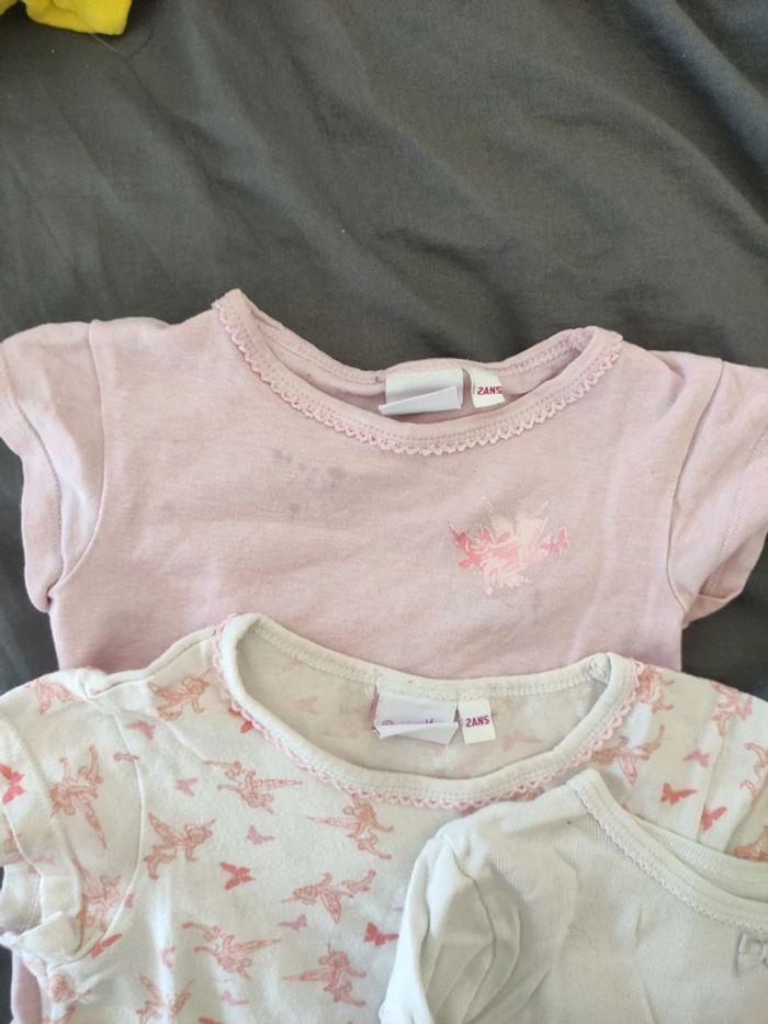 En coton. Beaucoup porté mais en bon état. Le Disney tout rose est taché.