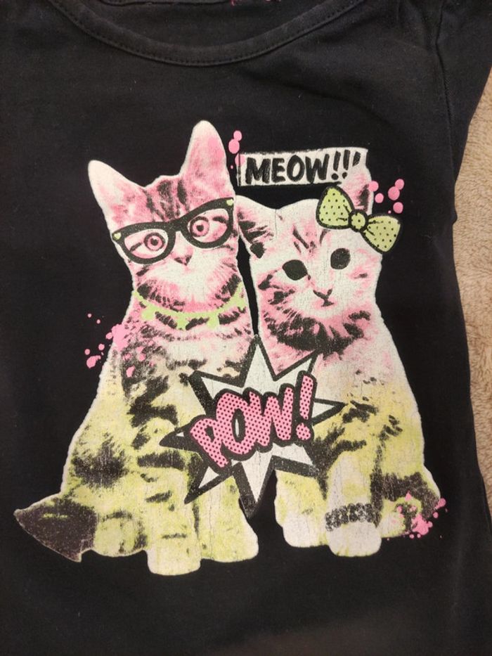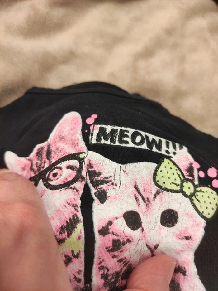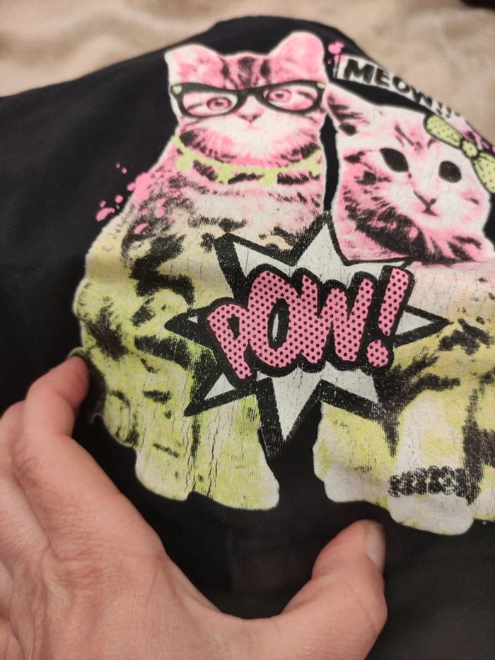 Porté mais bon état. Le motif est un tout petit peu craqué par endroits (visible uniquement quand on l'etire). Les couleurs du motif ne sont pas délavées, il est ainsi d'origine.