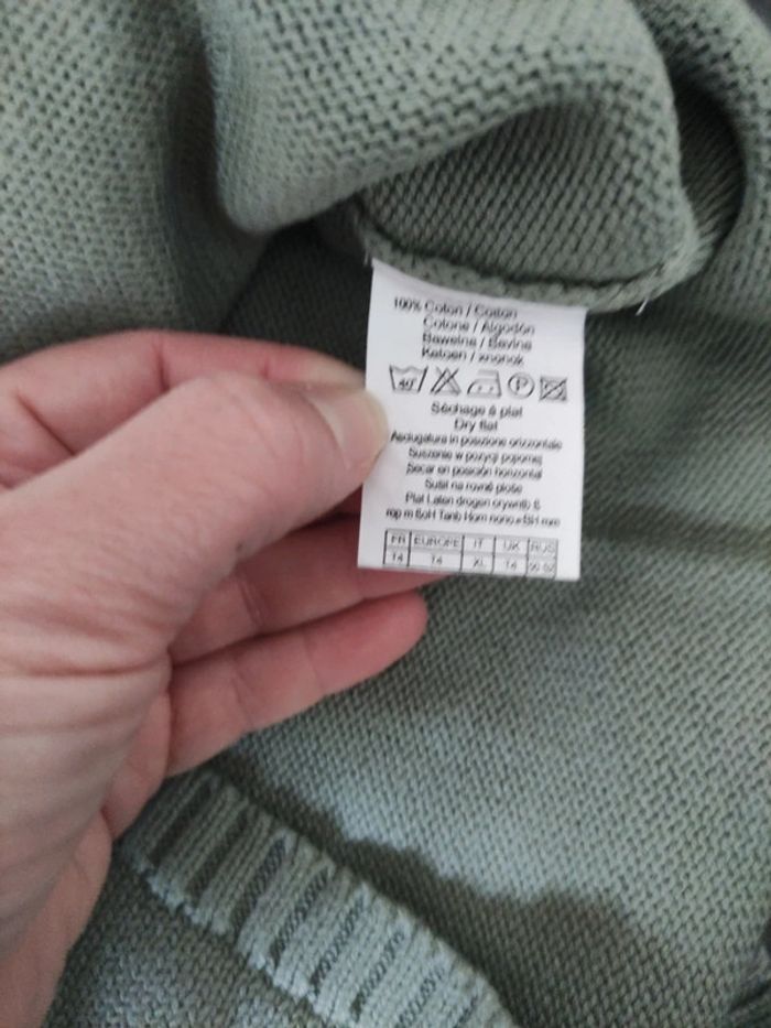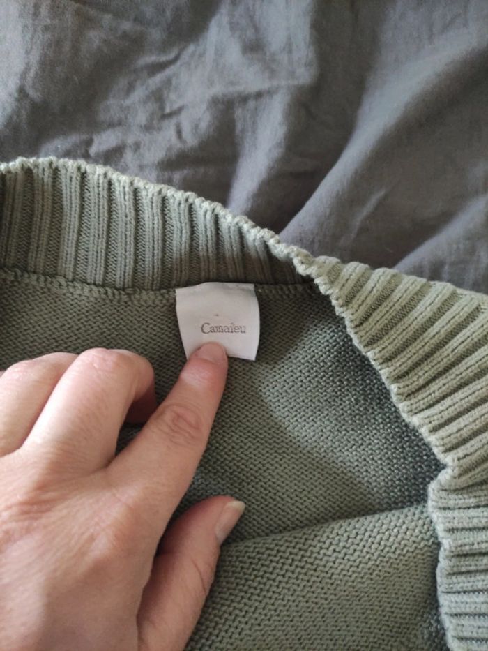 Pull en coton vert kaki clair mais plus foncé que le rendu photo. Peu porté très bon état. Largeur aisselles 44cm