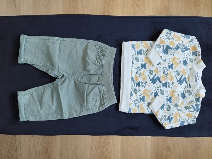 Ensemble sweat dinosaure (blanc, kaki, moutarde et bleu) avec pantalon style cargo kaki, taille 6 mois (67cm), très bon état.