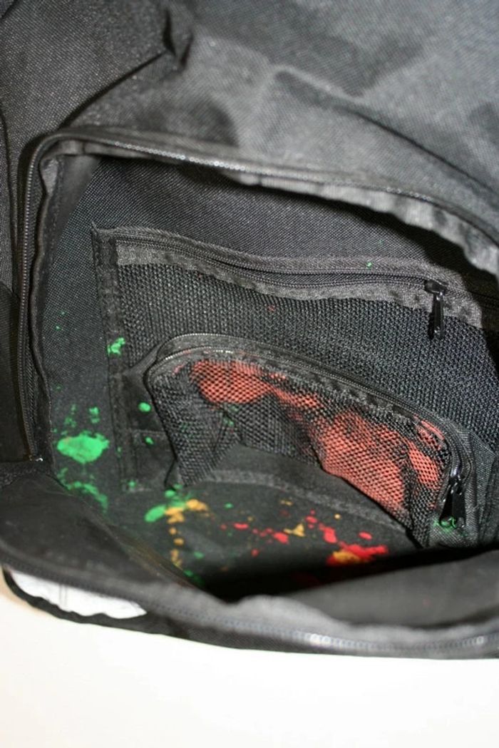 Sac à dos Collège RG512, une grande poche à l'avant (quelques petits trous d'usure + tâches de peinture à l'intérieur), 2 compartiments principaux (1 premier avec une pochette plastifiée + 1 deuxième avec une pochette zippée et porte clé), bretelles renforcées + renfort en mousse pour le dos et les épaules, 700g Dimensions 32 x 24 x 42 cm
