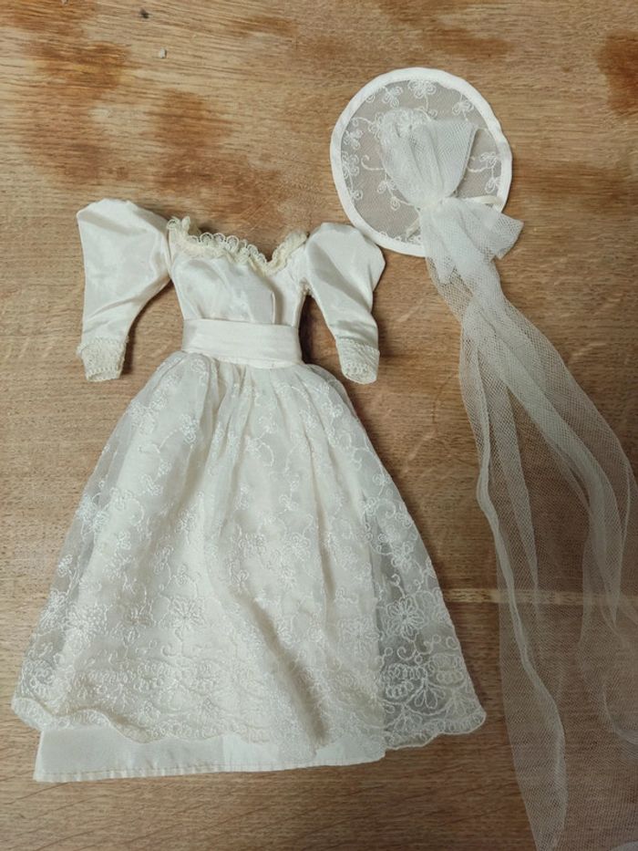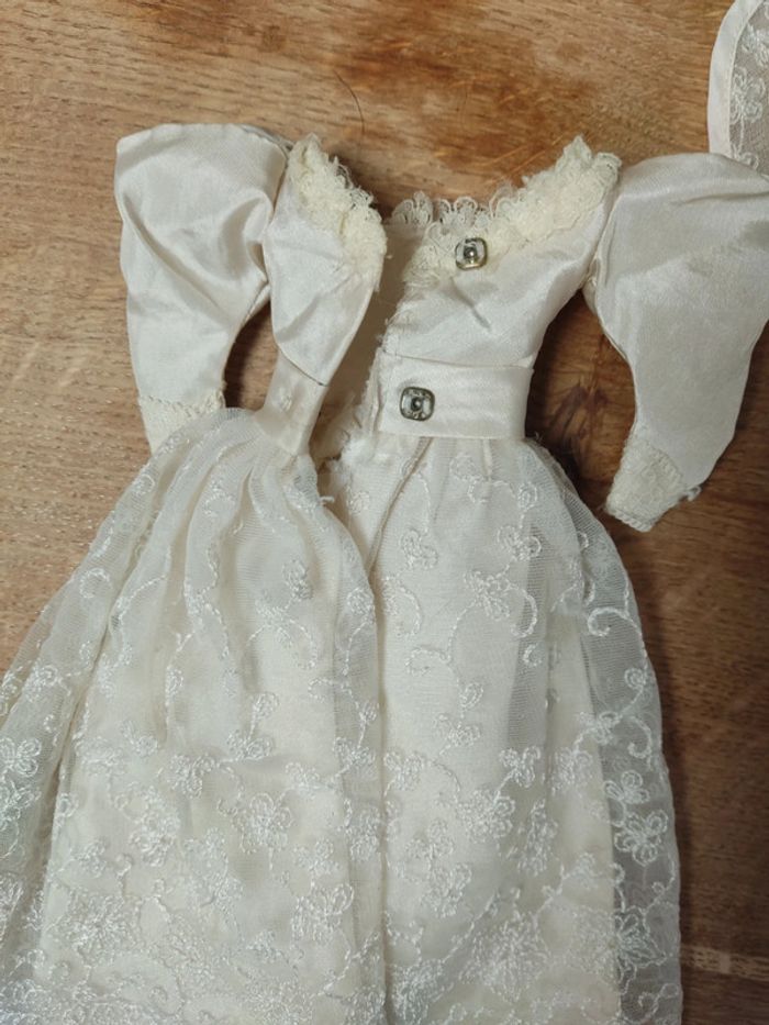 Avec pressions dans le dos Vendu en l'état. Les photos servent de description :) Traine sur le chapeau #robedemarieebarbie #robebarbie #mariée #mariagebarbie #barbievintage