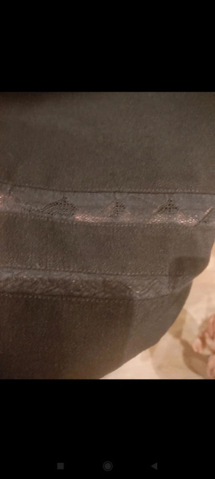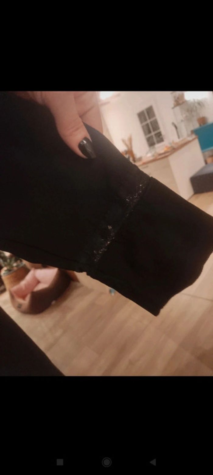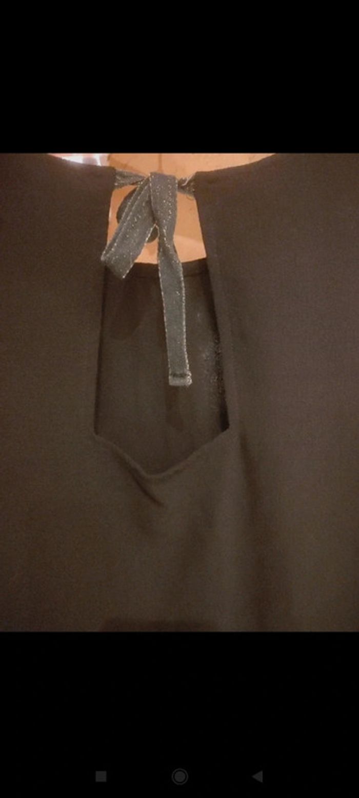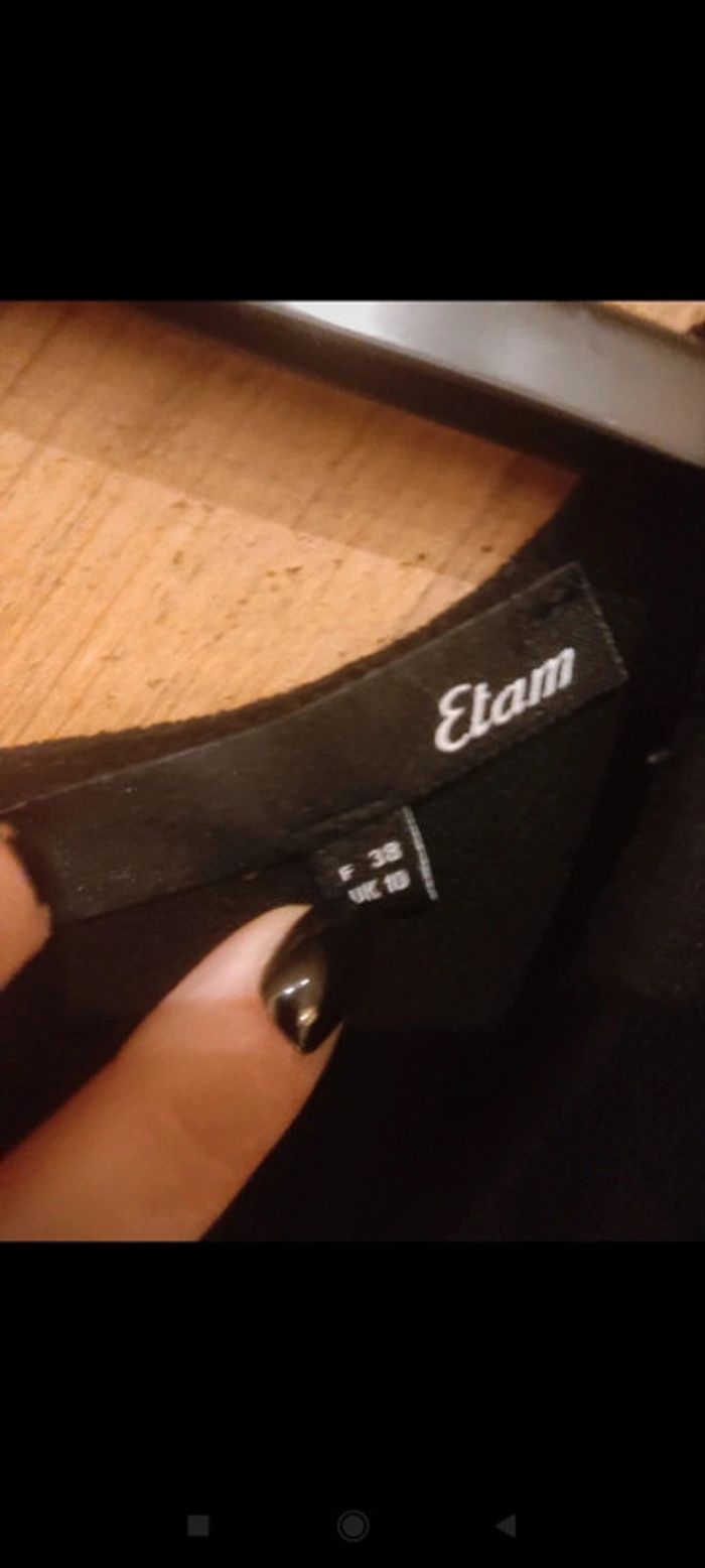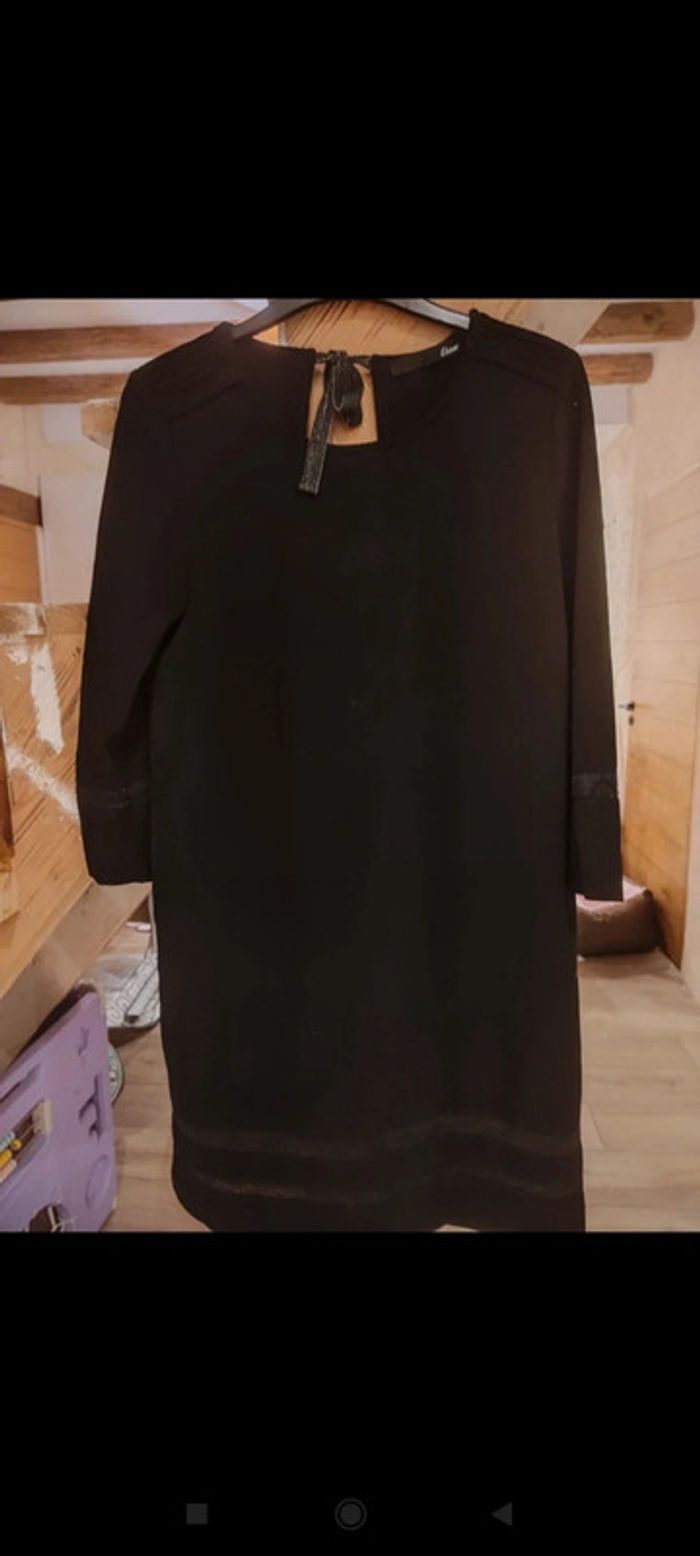 Superbe robe noire élégante. Coupe droite pouvant être cintrée avec une ceinture. Petite broderie en bas de la robe et sur le bas des manches. Manches 3/4 Noeud dans le haut du dos Les photos servent de description #robeetam #robenoire #détailbroderie #etam #ribesoirée