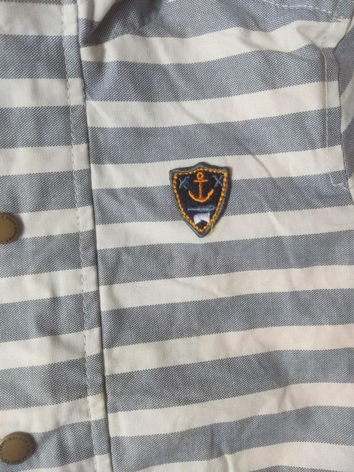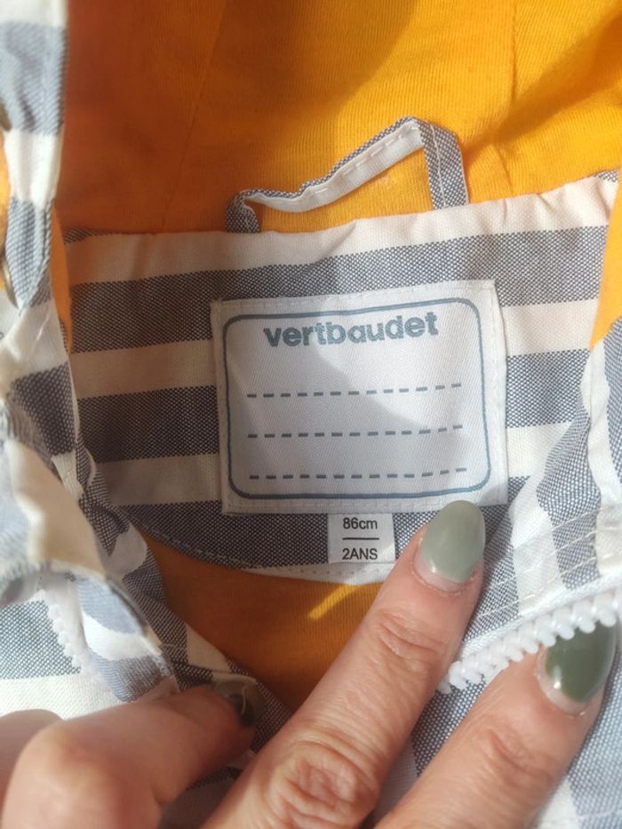 Motif marin Une toute petite tache cf photo. Peut éventuellement partir avec un détachant Très bon état pour le reste ! Bleu gris et blanc #vestemariniere #vesteimperméable #vertbaudet