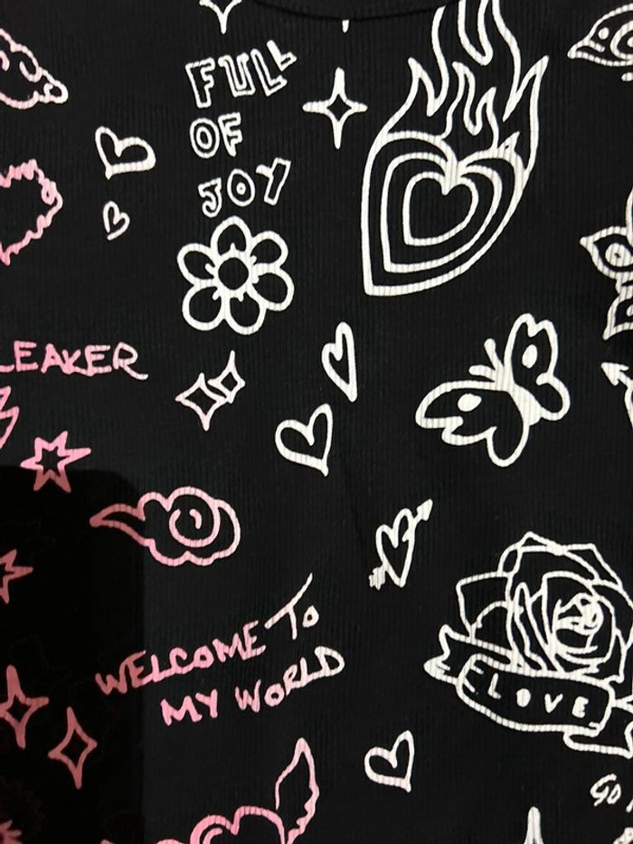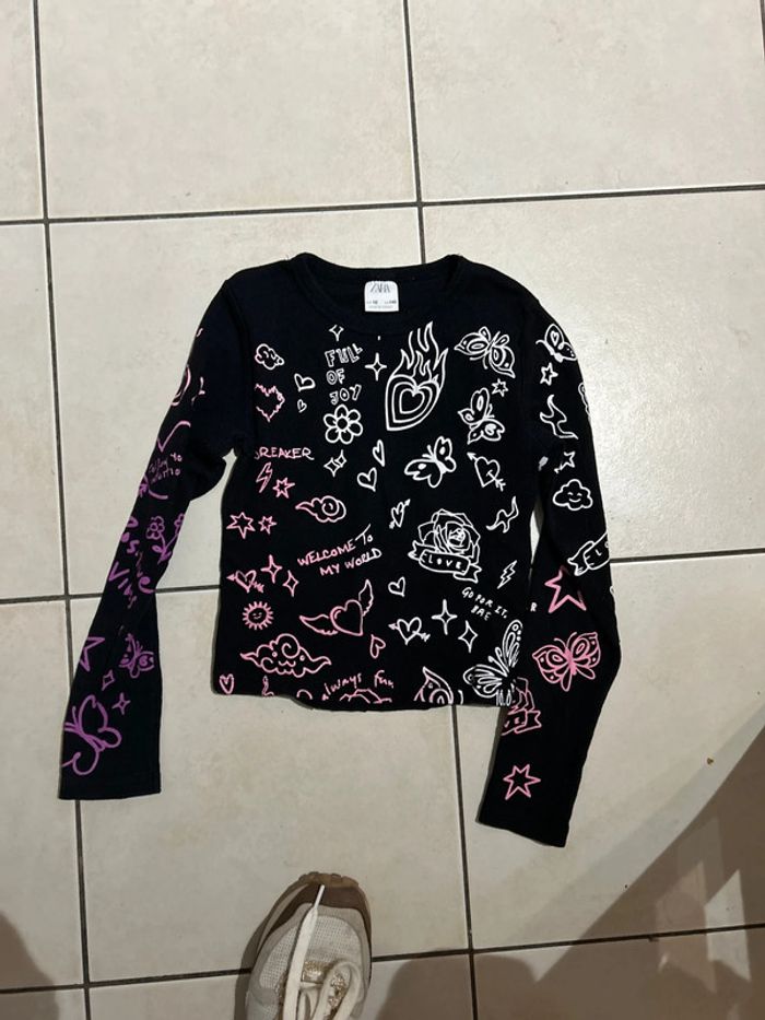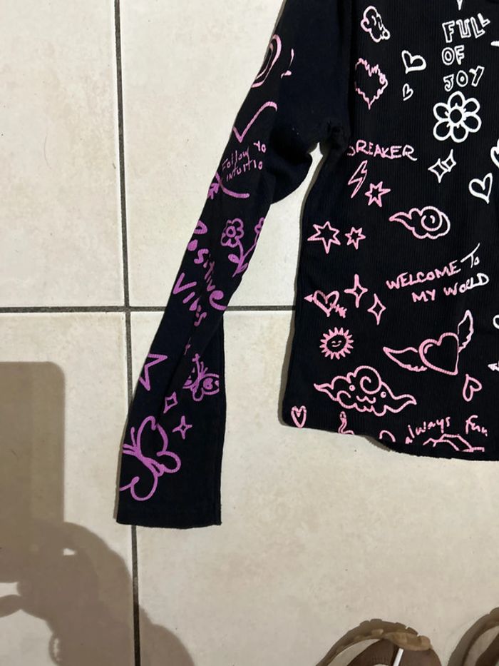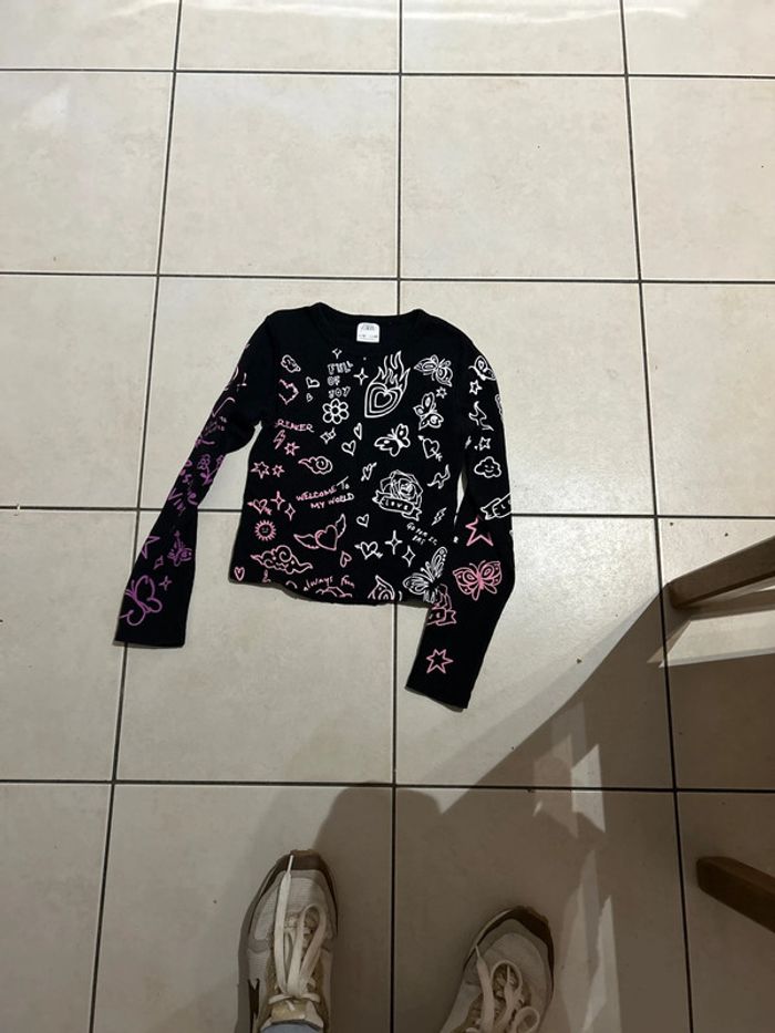 Haut noir avec des tags roses et blancs manches longues taille 10 ans
