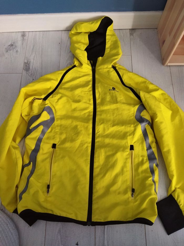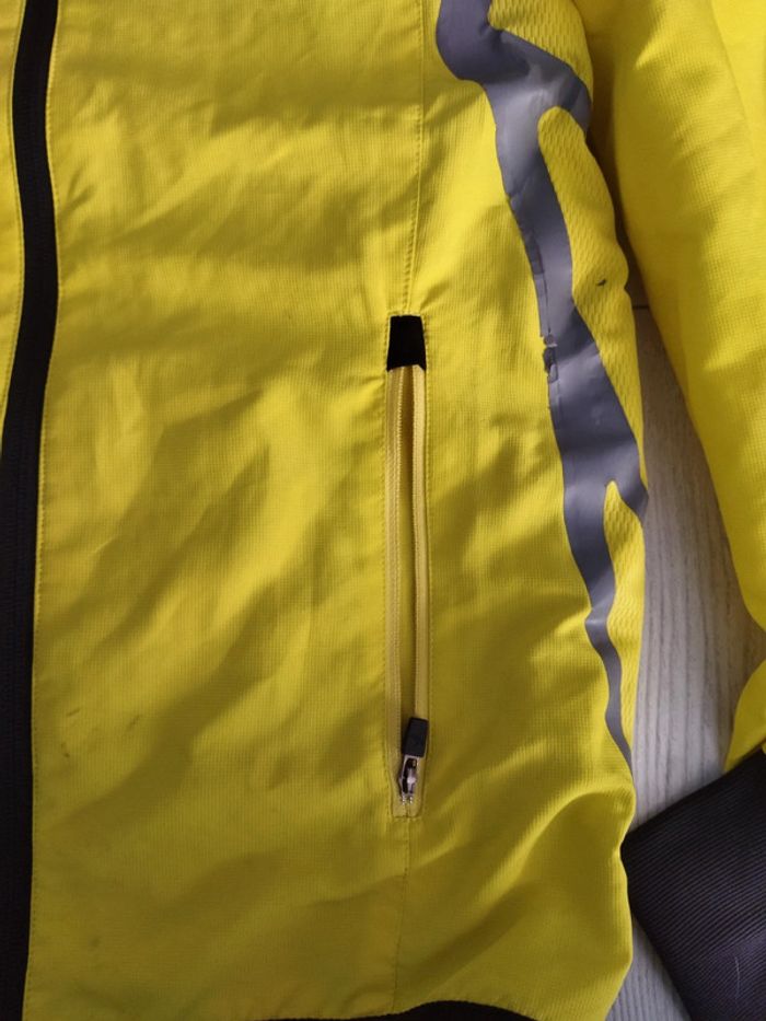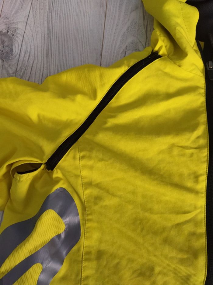 Veste sport jaune manches amovibles pour course et autres sports. Quelques défauts (voir photos), les petites tâches s'enlèvent peut être... Taille S